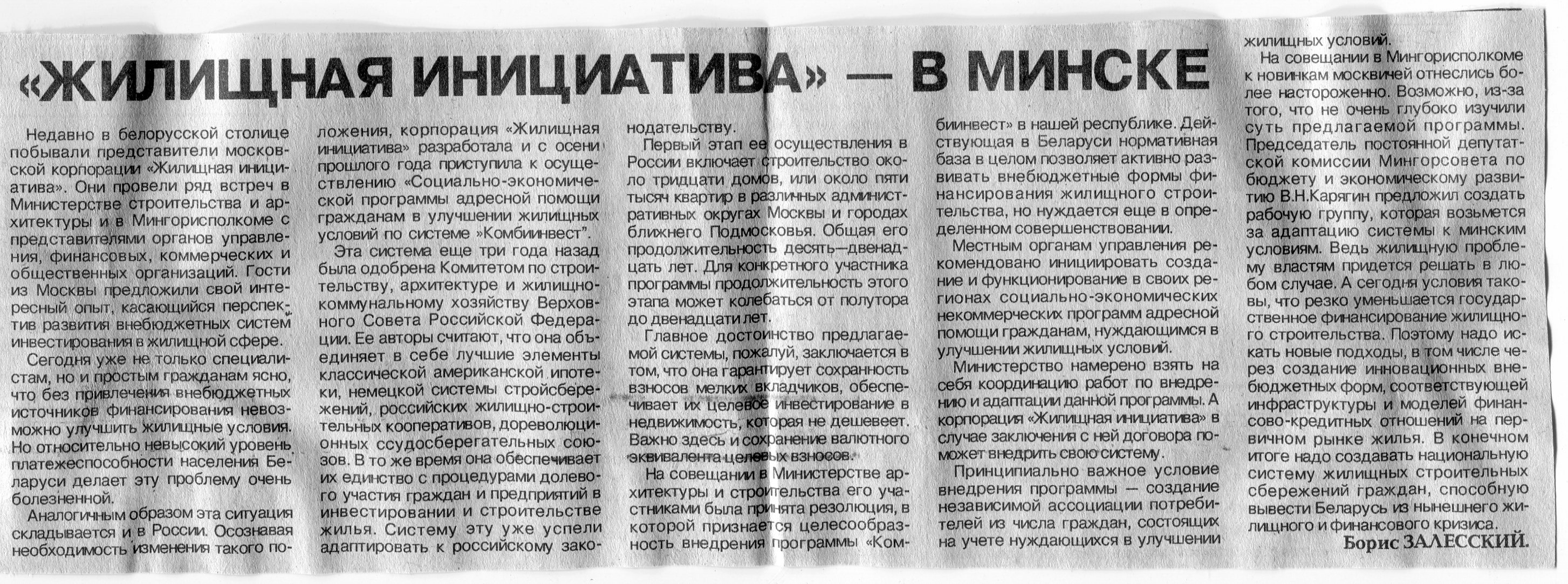 Залесский, Б. "Жилищная инициатива " - в Минске / Б. Залесский // Вечерний Минск. - 1995.- 28 июл.