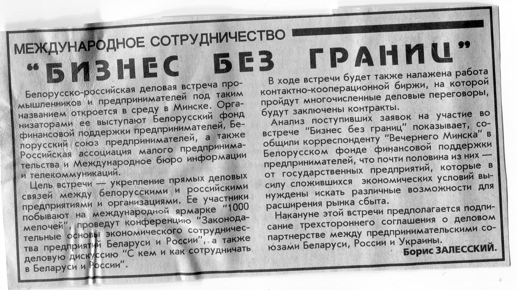 Залесский, Б. "Бизнес без границ" / Б. Залесский // Вечерний Минск. - 1996. - 9 сент.