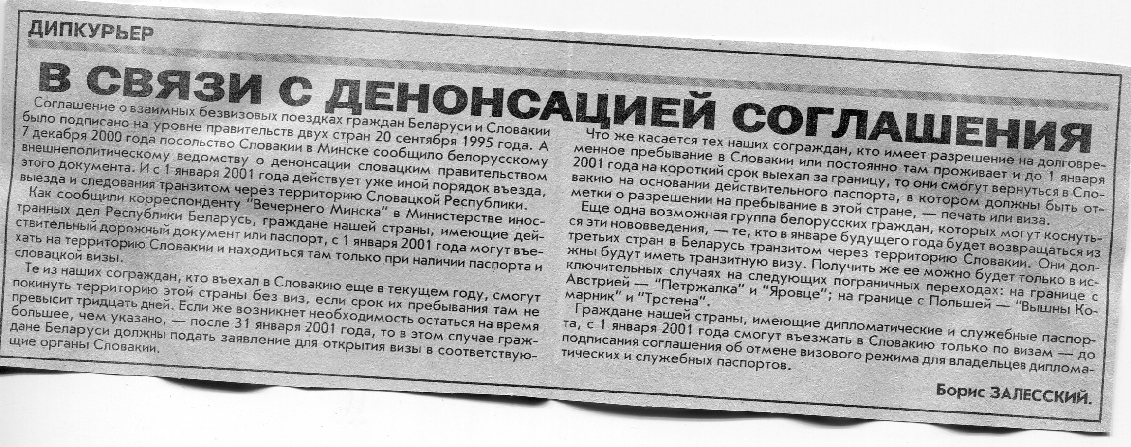 Залесский, Б. В связи с денонсацией соглашения / Б. Залесский // Вечерний Минск. - 2000. - 22 дек.