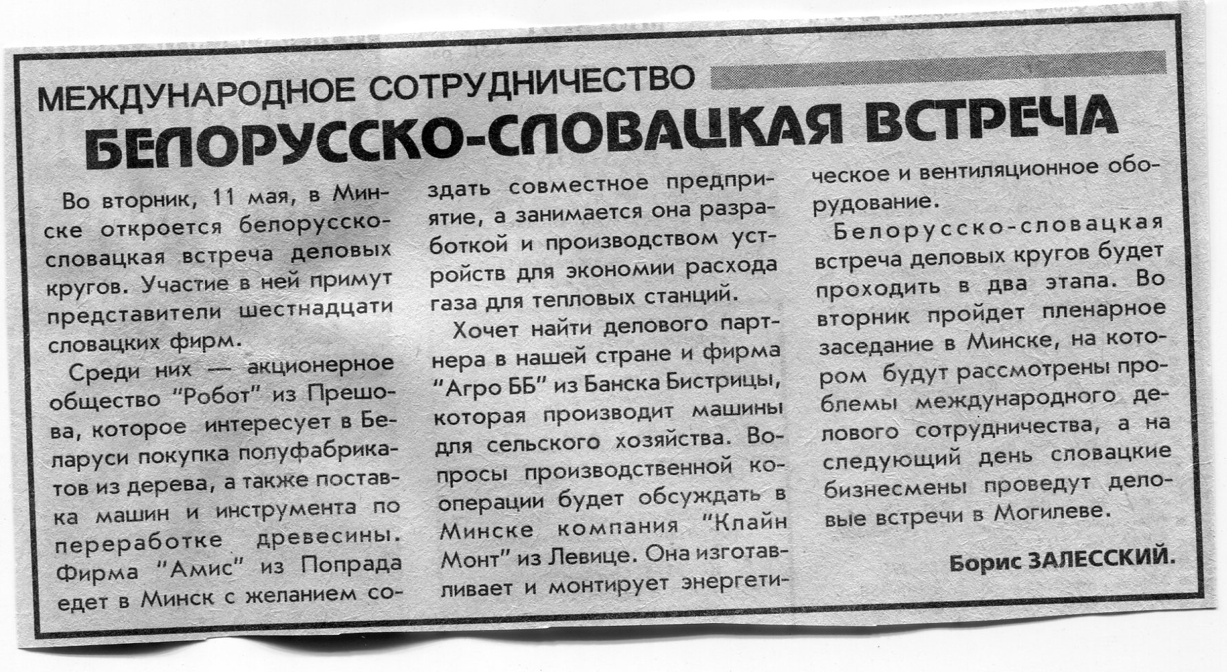 Залесский, Б. Белорусско-словацкая встреча / Б. Залесский // Вечерний Минск. - 1999. - 10 мая.