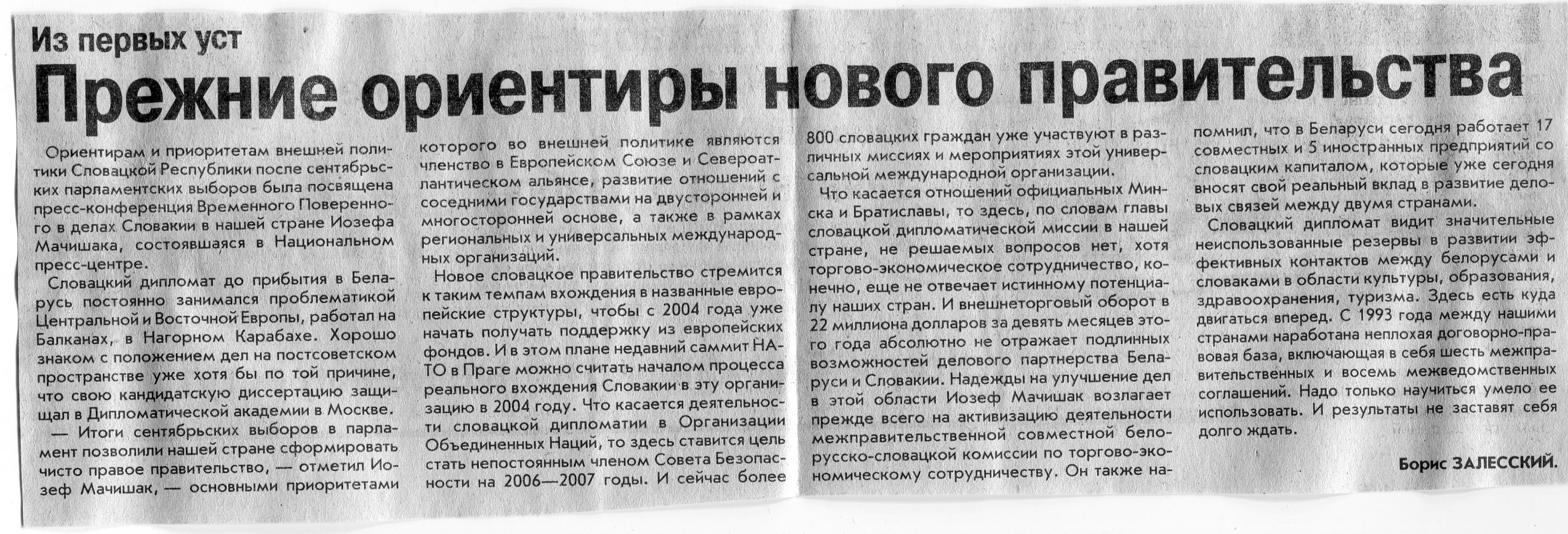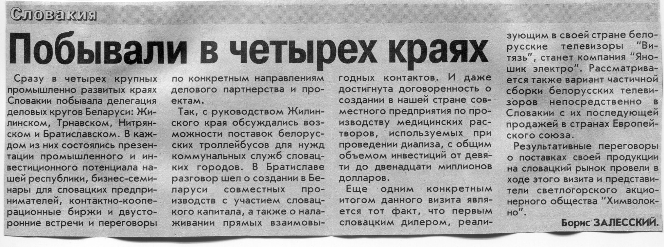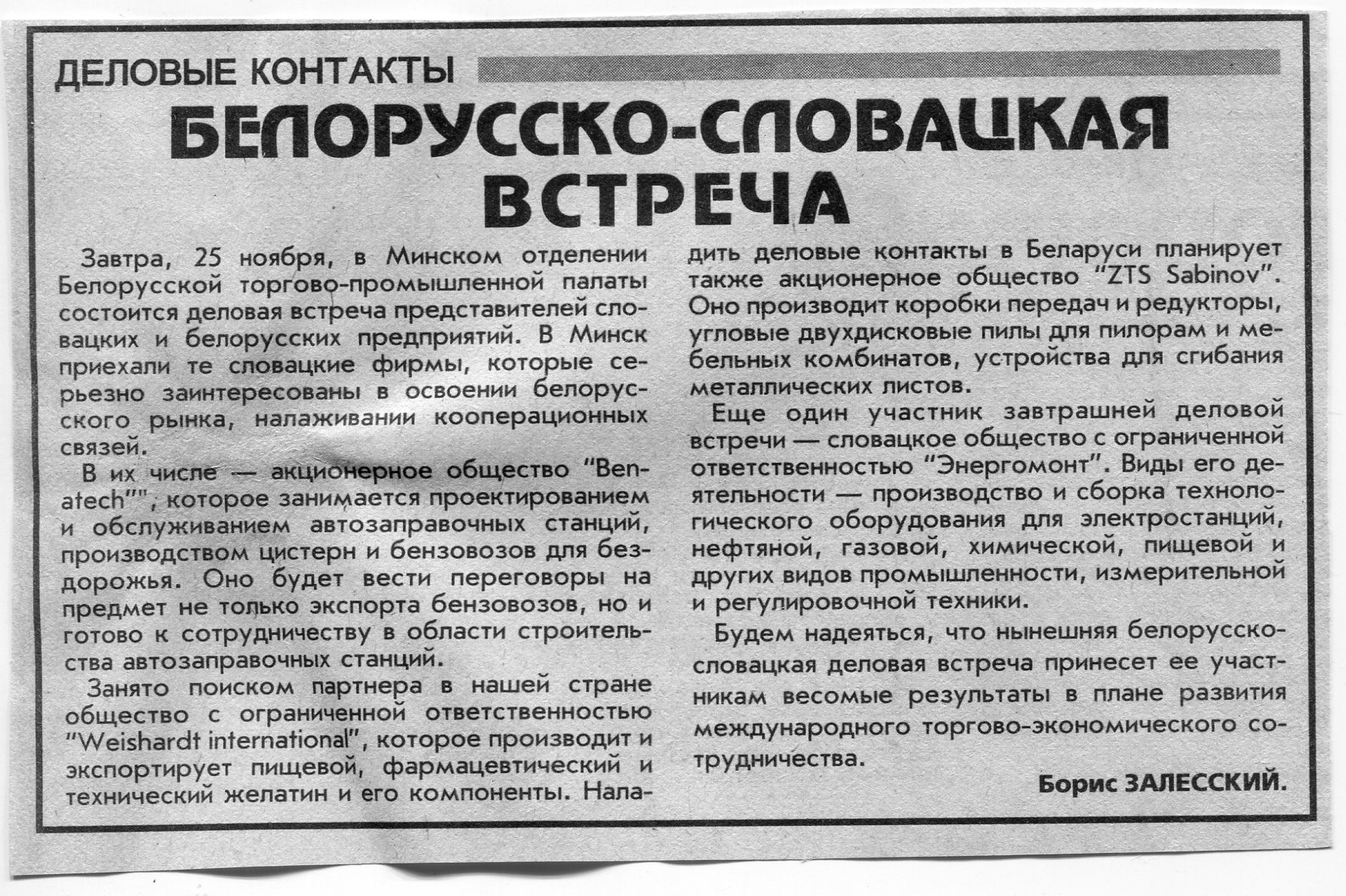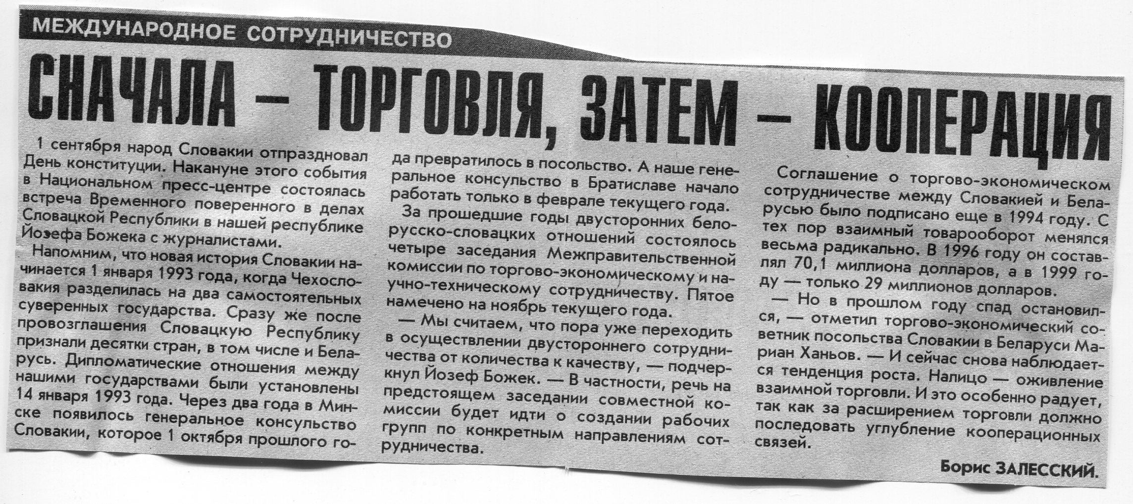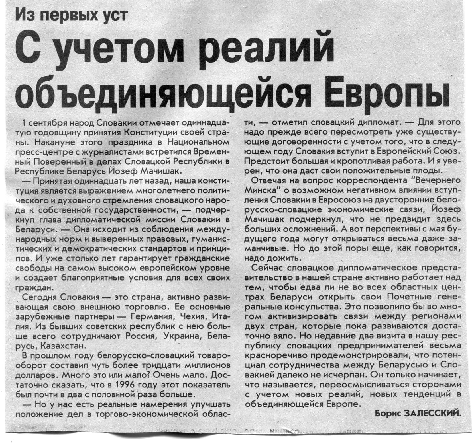 Залесский, Б. Белорусско-словацкая встреча / Б. Залесский // Вечерний Минск. - 1999. - 24 нояб.