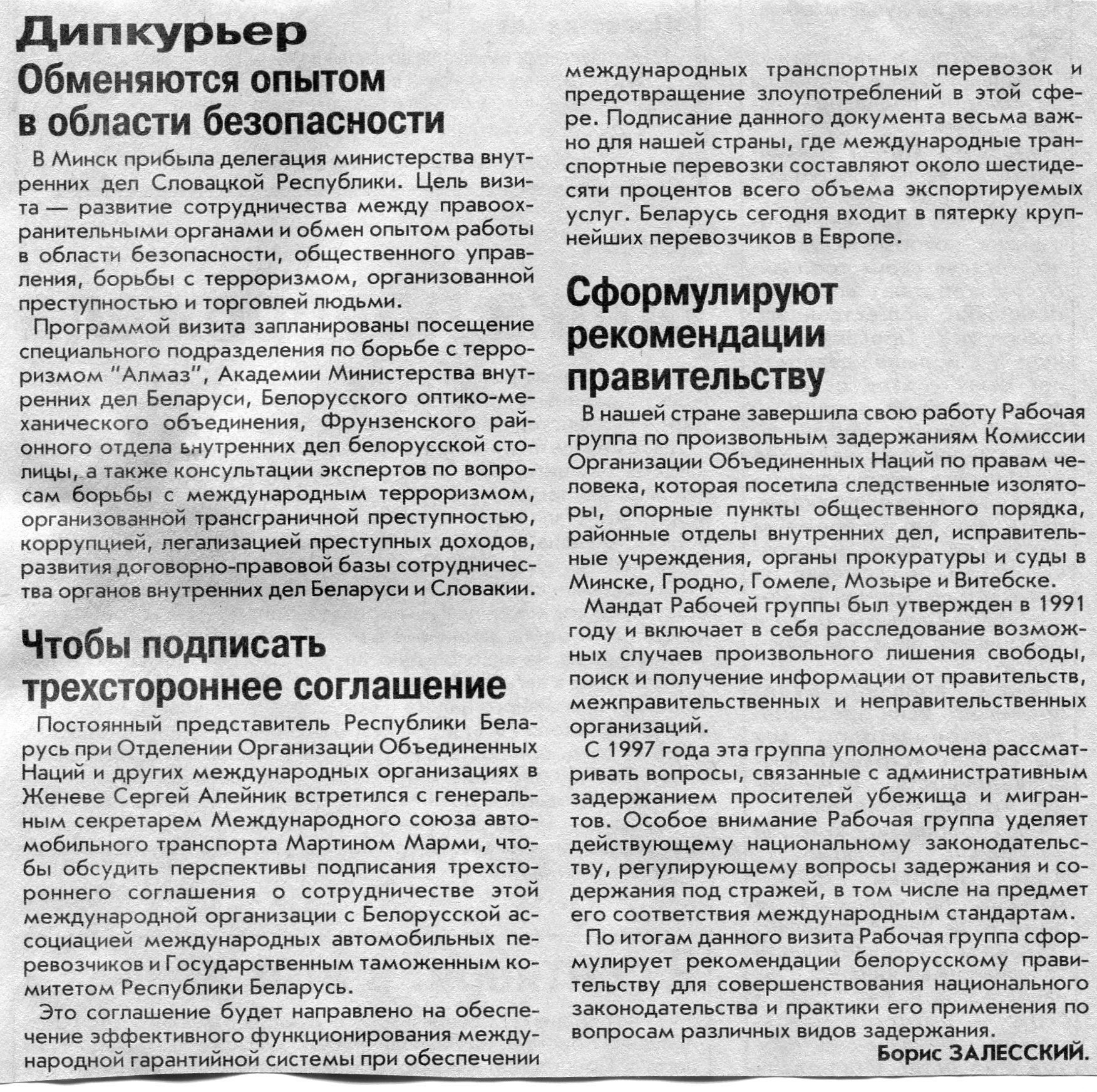 Залесский, Б. Обменяются опытом в области безопасности / Б. Залесский // Вечерний Минск. - 2004. - 2 сент.
