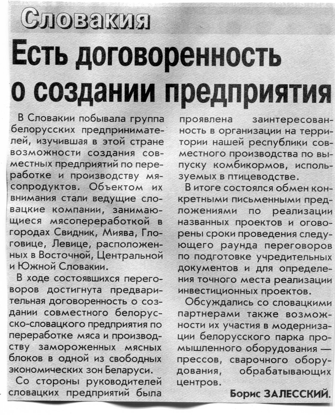 Залесский, Б. Есть договоренность о создании предприятия / Б. Залесский // Вечерний Минск. - 2004. - 19 февр.