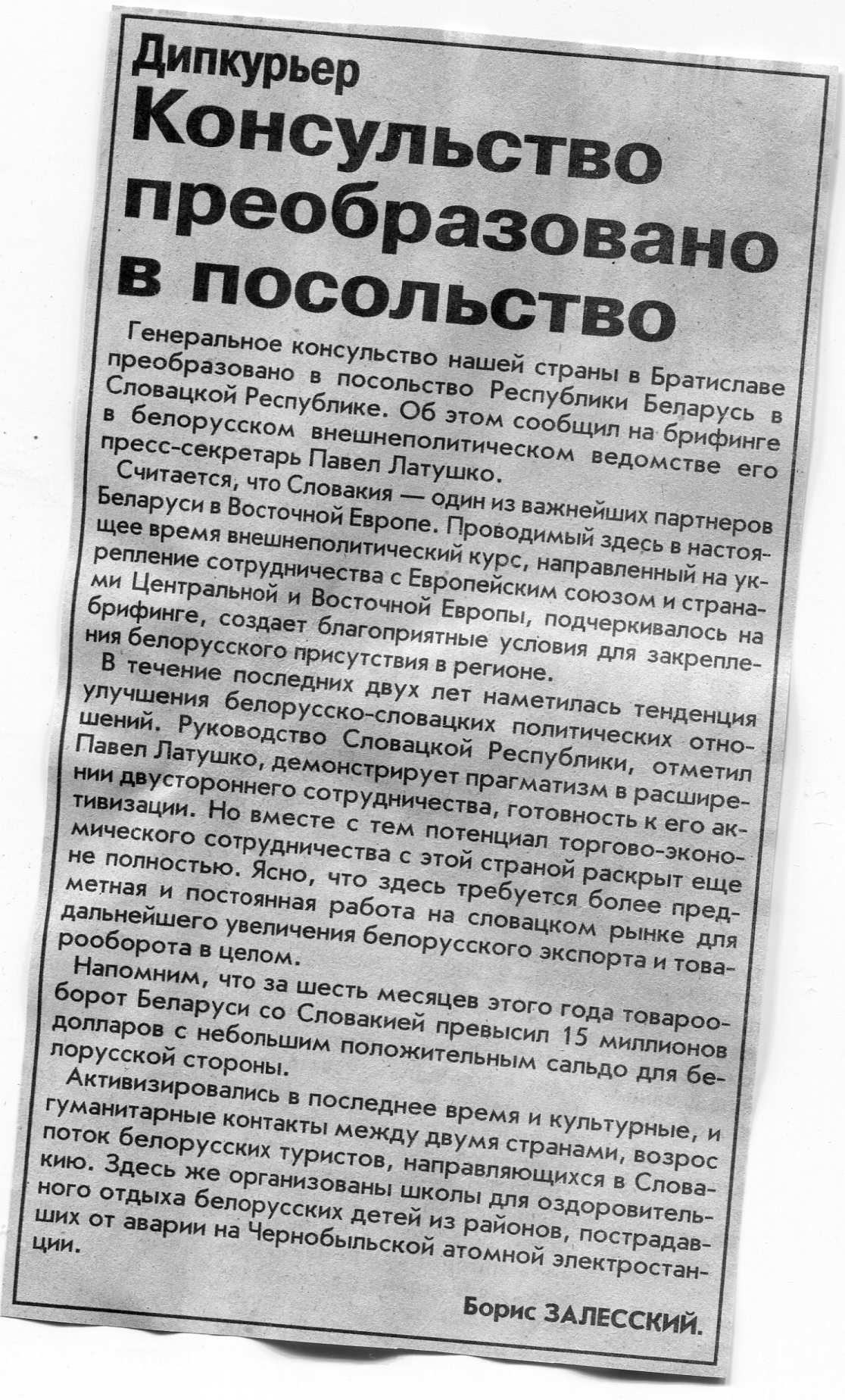 Залесский, Б. Консульство преобразовано в посольство / Б. Залесский // Вечерний Минск. - 2002. - 19 сент.