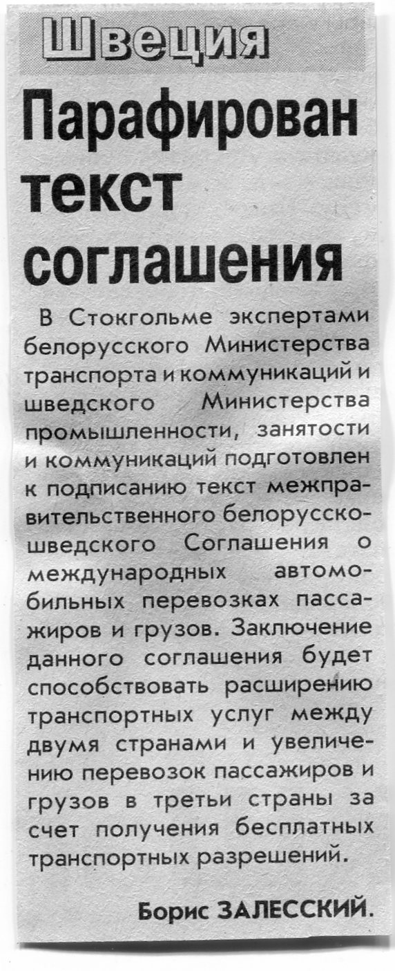 Залесский, Б. Парафирован текст соглашения / Б. Залесский // Вечерний Минск. - 2004. - 6 мая.