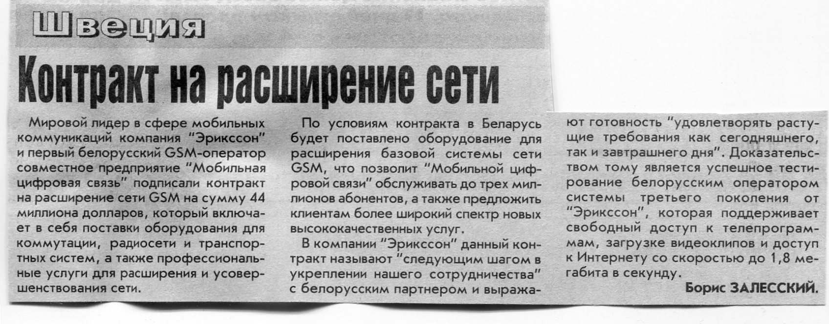 Залесский, Б. Контракт на расширение сети / Б. Залесский // Вечерний Минск. - 2006. - 23 июн.