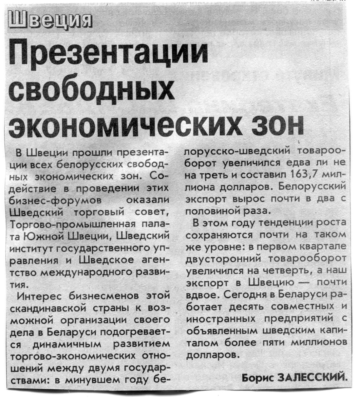 Залесский, Б. Презентации свободных экономических зон / Б. Залесский // Вечерний Минск. - 2004. - 14 мая.