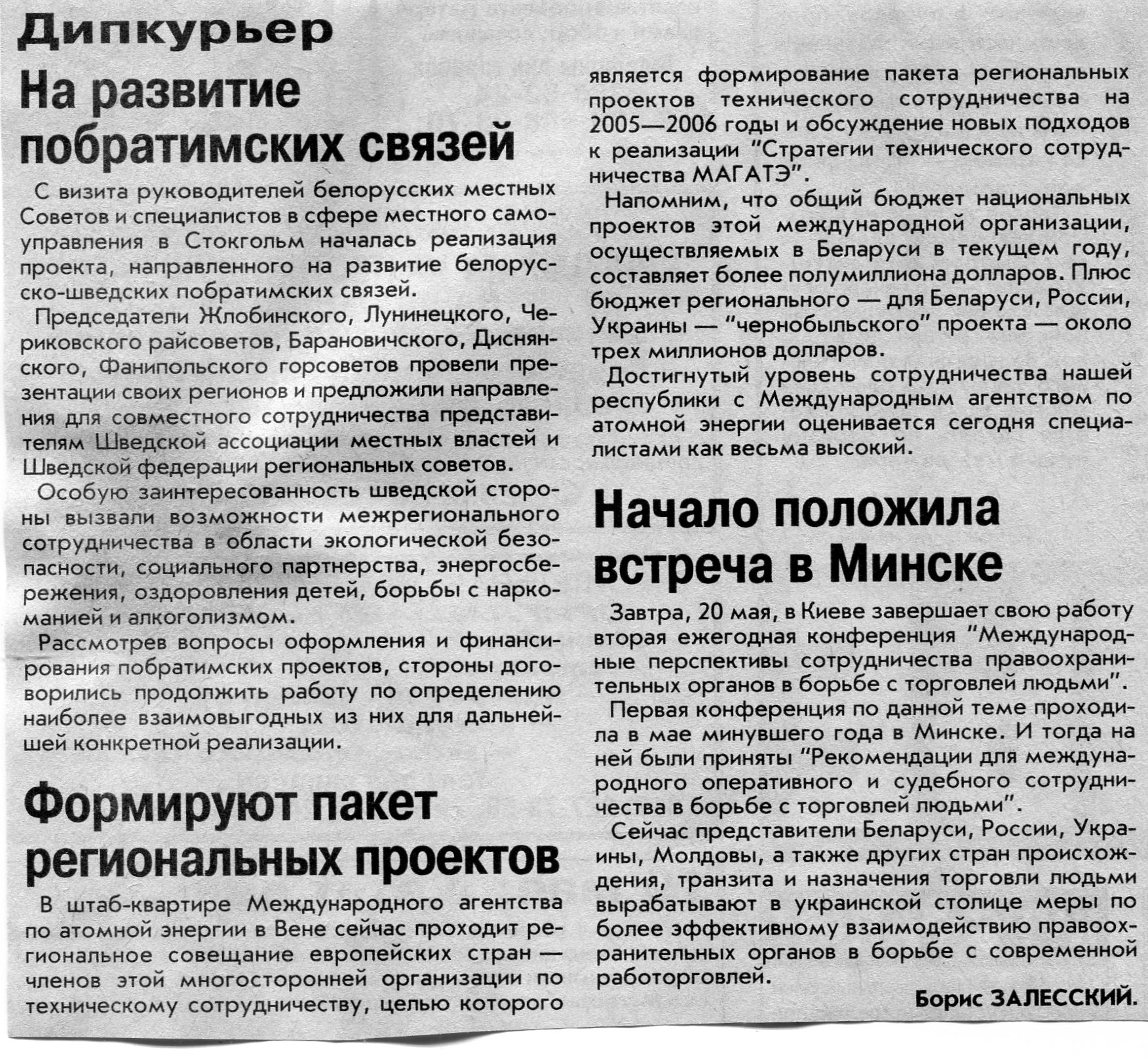 Залесский, Б. На развитие побратимских связей / Б. Залесский // Вечерний Минск. - 2004. - 19 мая.