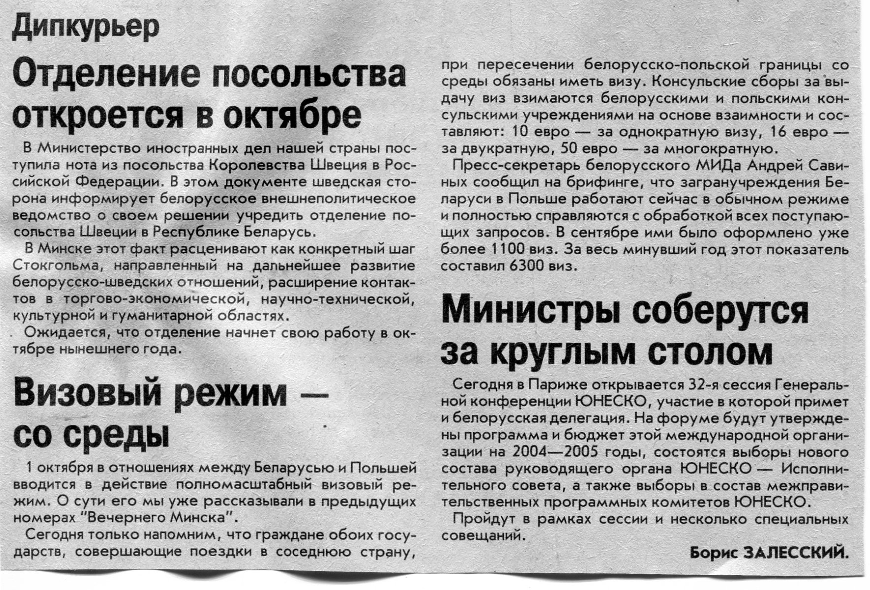 Залесский, Б. Отделение посольства откроется в октябре / Б. Залесский // Вечерний Минск. - 2003. - 29 сент.