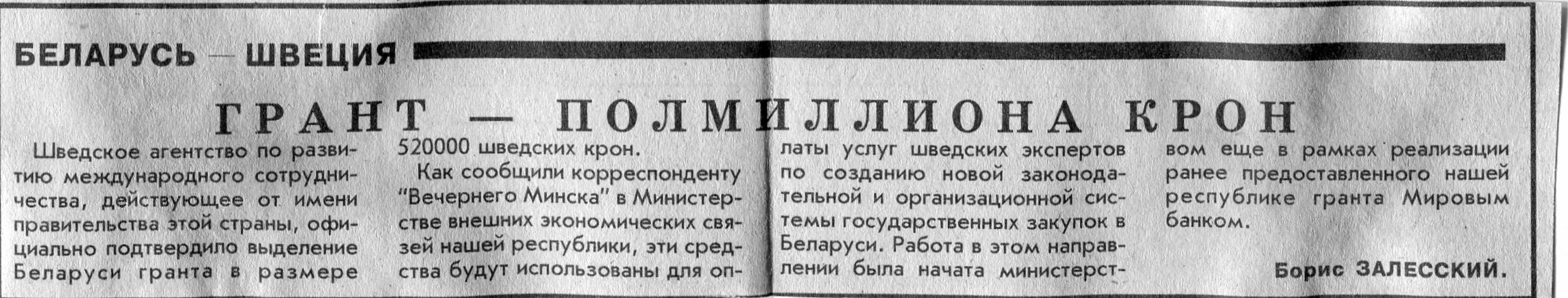 Залесский, Б. Грант - полмиллиона крон / Б. Залесский // Вечерний Минск. - 1995. - 27 сент.