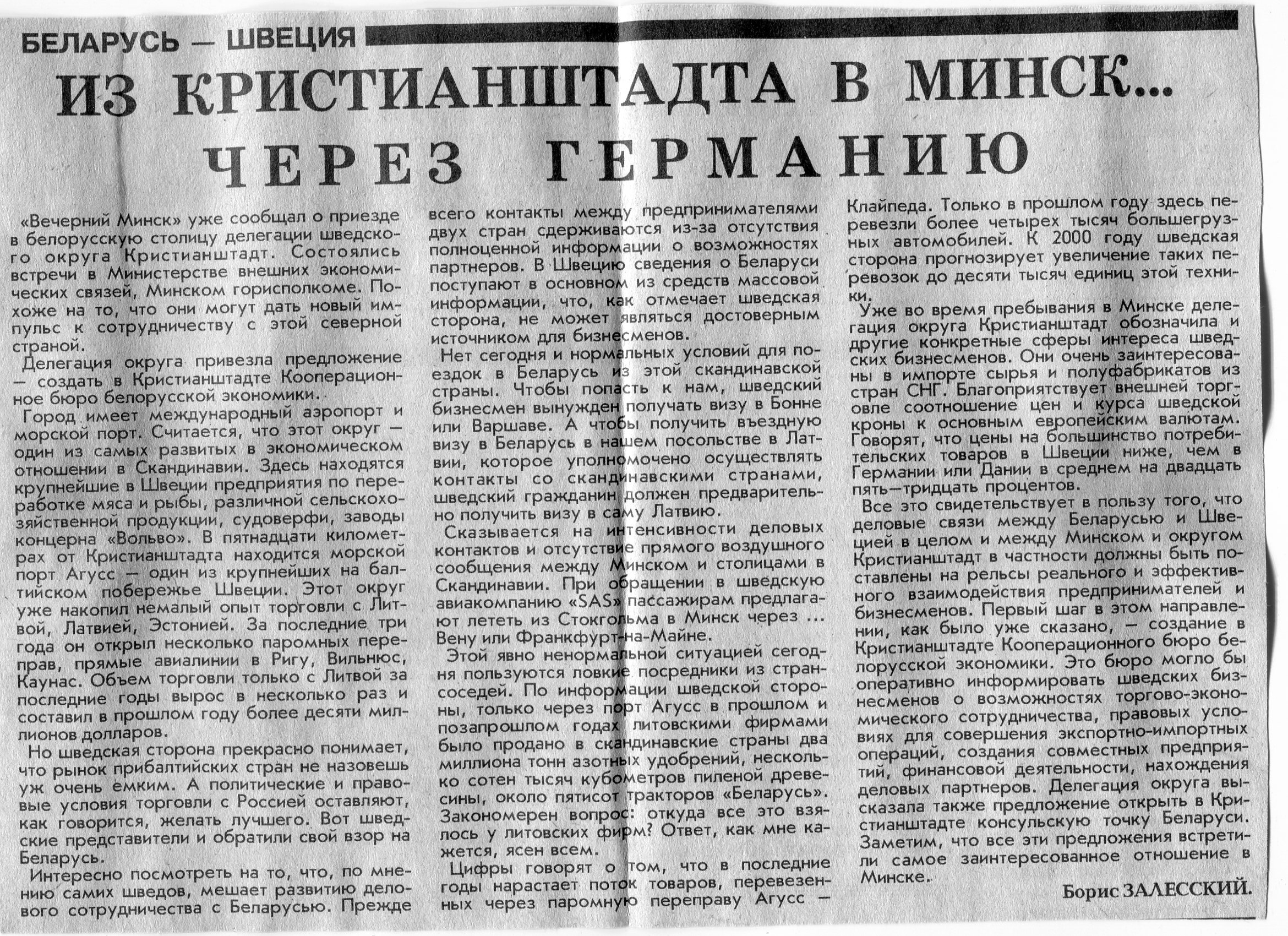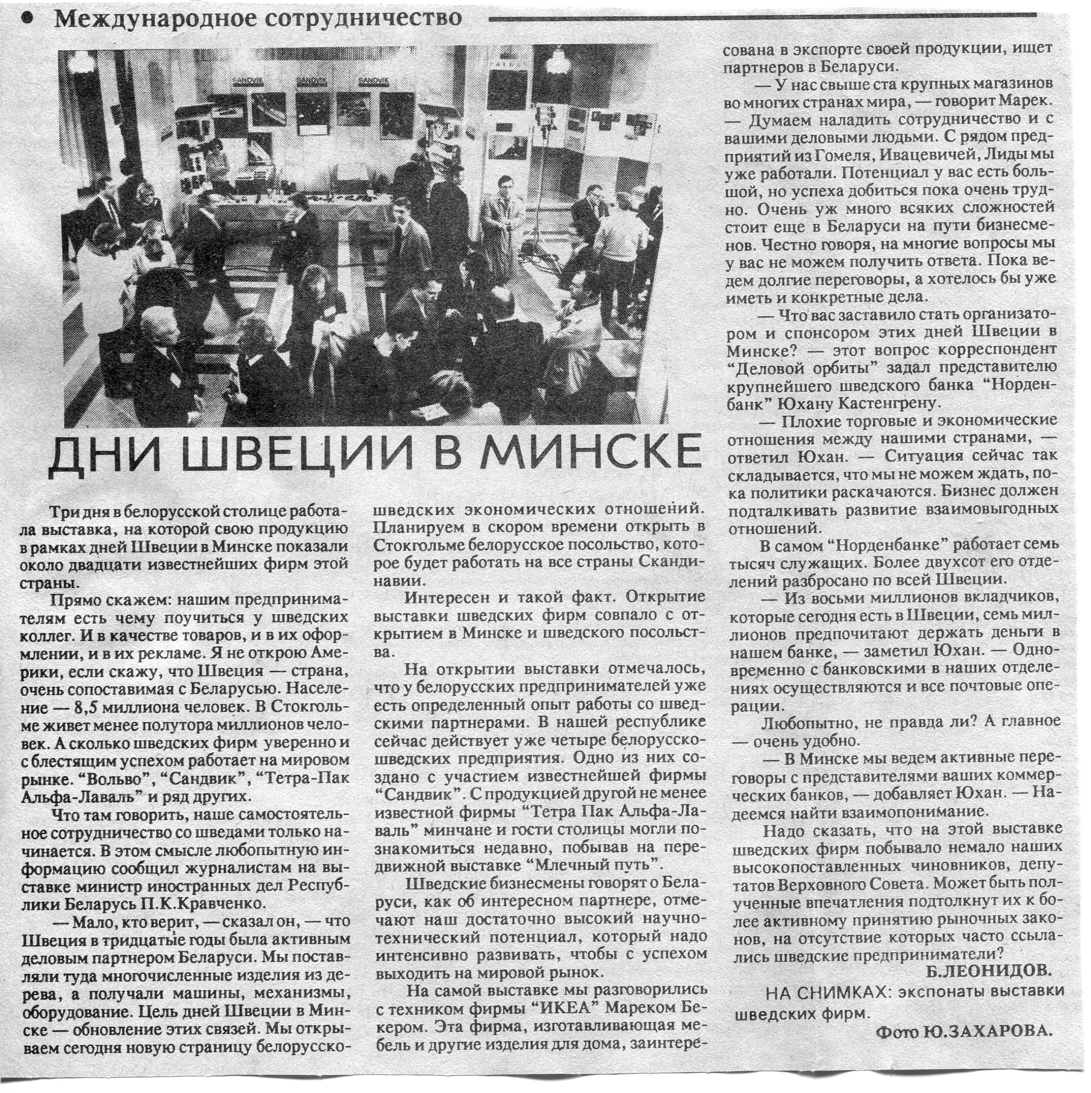 Леонидов, Б. Дни Швеции в Минске / Б. Залесский // Деловая орбита. - 1992. - №19. - С. 1.