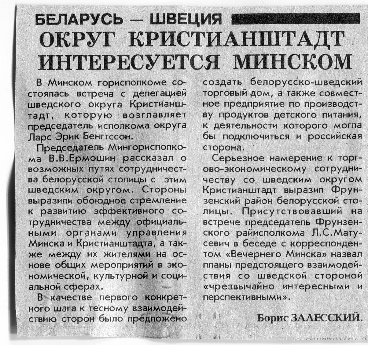 Залесский, Б. Округ Кристианштадт интересуется Минском / Б. Залесский // Вечерний Минск. - 1995. - 29 авг.