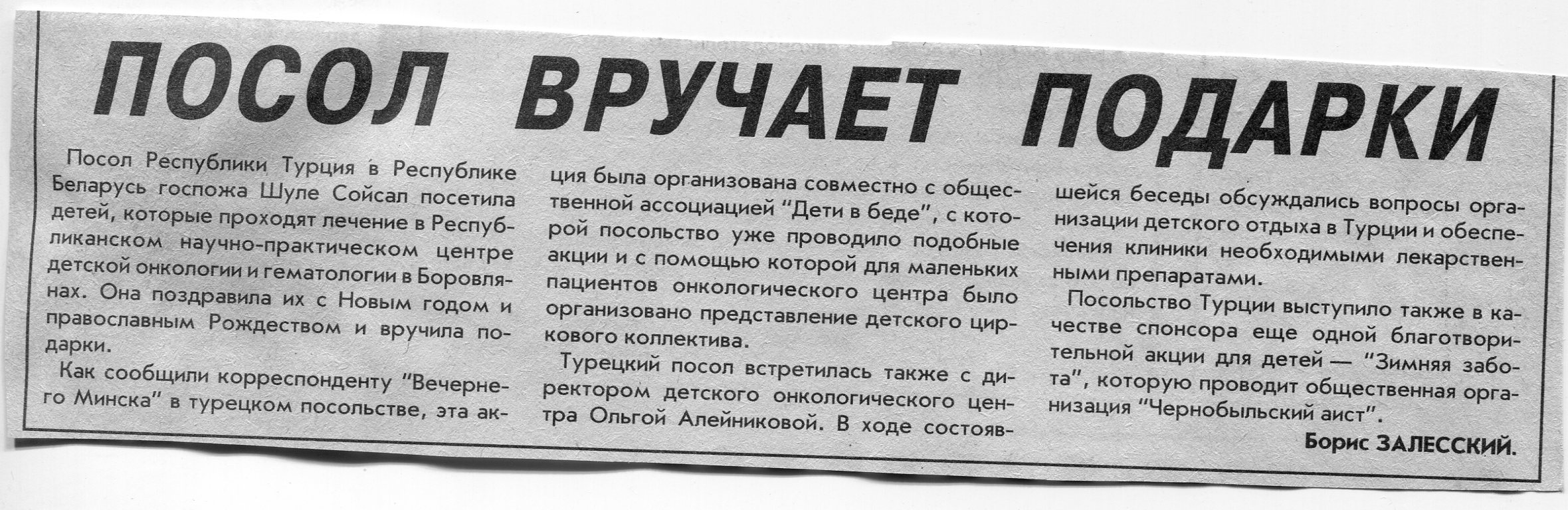 Залесский, Б. Посол вручает подарки / Б. Залесский // Вечерний Минск. - 2001 - 12 янв.