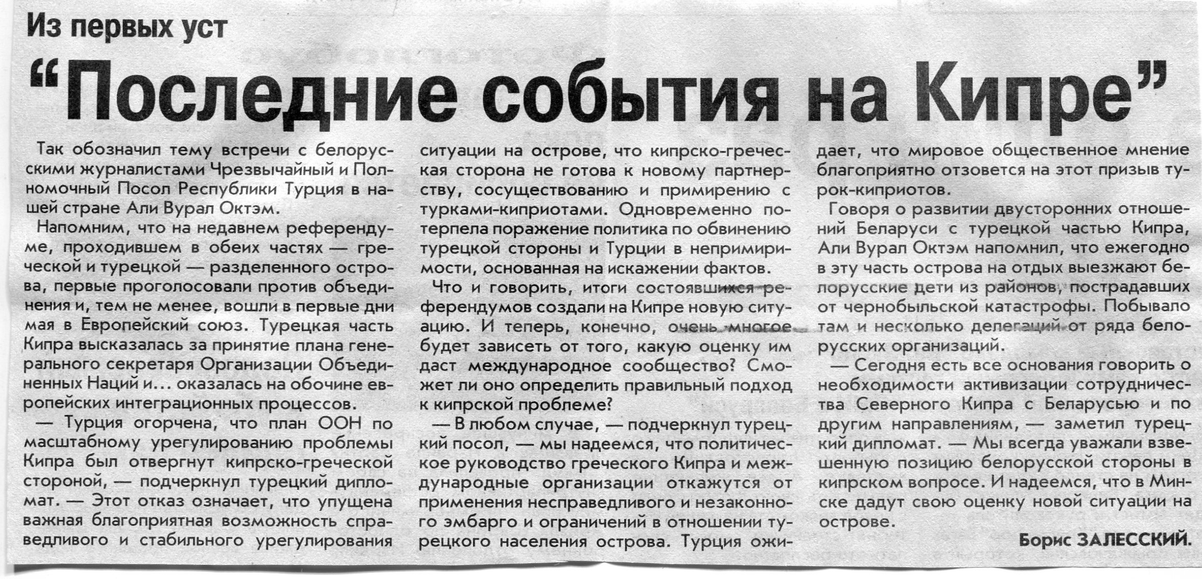 Залесский, Б. "Последние события на Кипре" / Б. Залесский // Вечерний Минск. - 2004. - 4 мая.