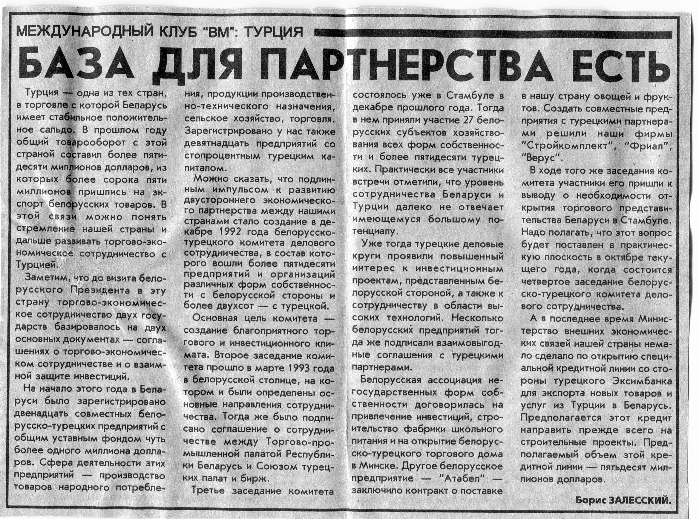 Залесский, Б. База для партнерства есть / Б. Залесский // Вечерний Минск. - 1996. - 30 июл.