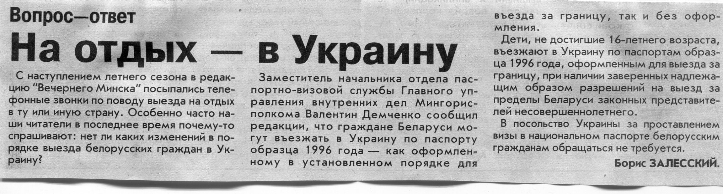 Залесский, Б. На отдых - в Украину / Б. Залесский / Вечерний Минск. - 2004. - 11 июн.