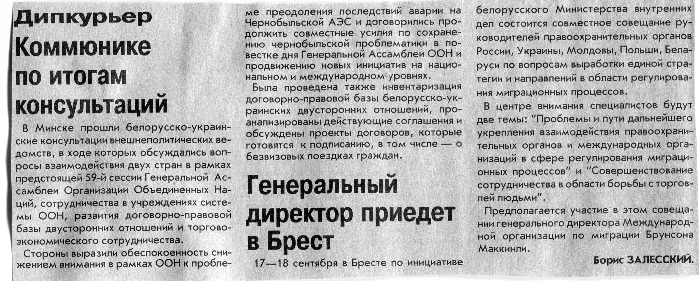 Залесский, Б. Коммюнике по итогам консультаций / Б. Залесский // Вечерний Минск. - 2004. - 9 сент.