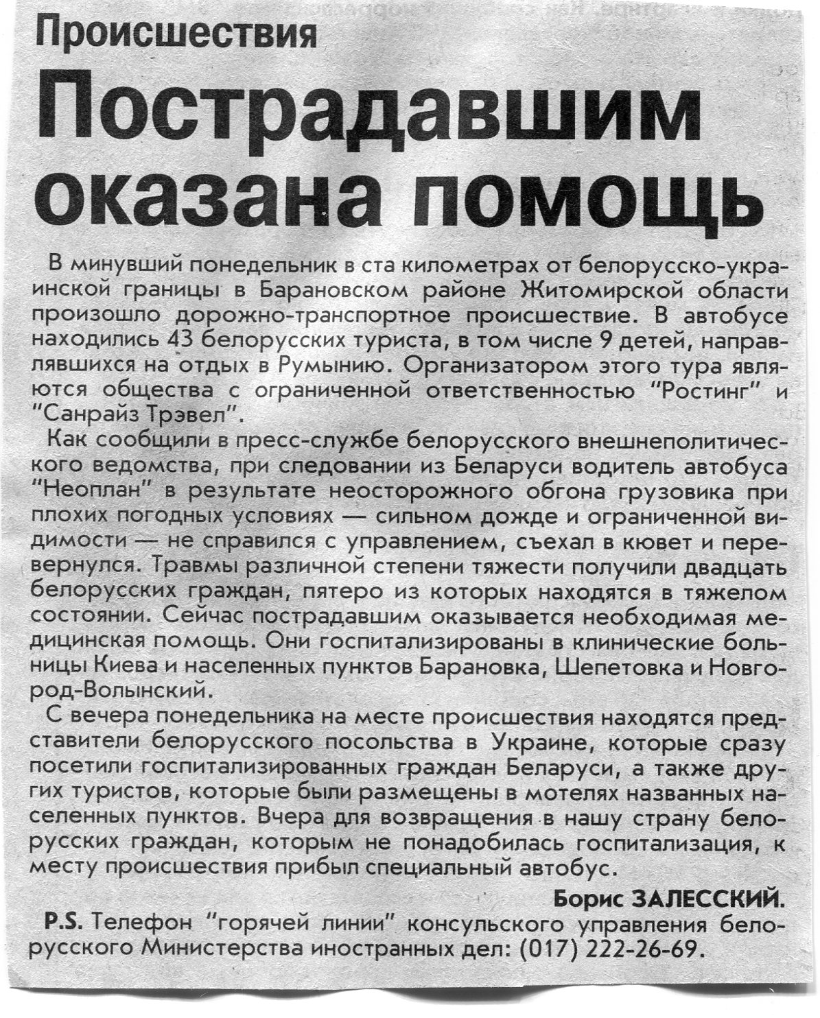 Залесский, Б. Пострадавшим оказана помощь / Б. Залесский / Вечерний Минск. - 2005. - 10 авг.
