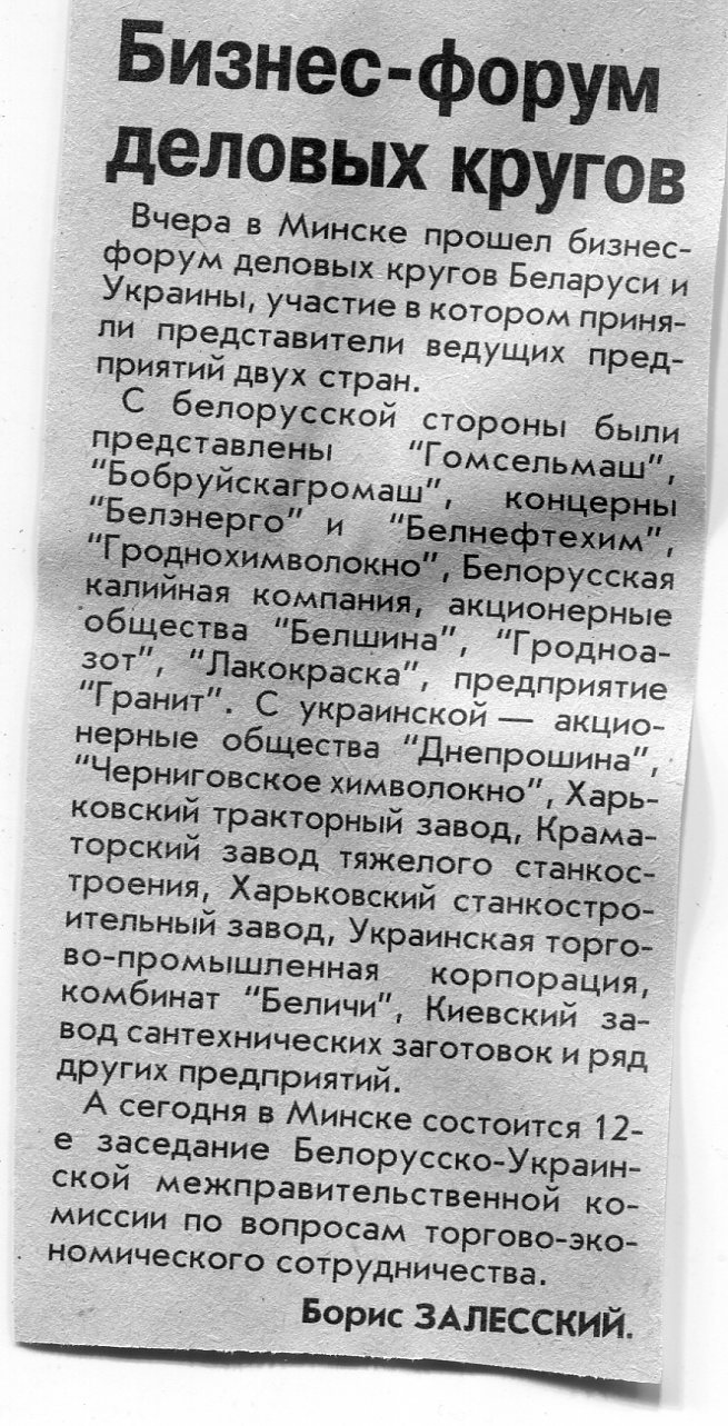 Залесский, Б. Бизнес-форум деловых кругов / Б. Залесский / Вечерний Минск. - 2006. - 16 февр.