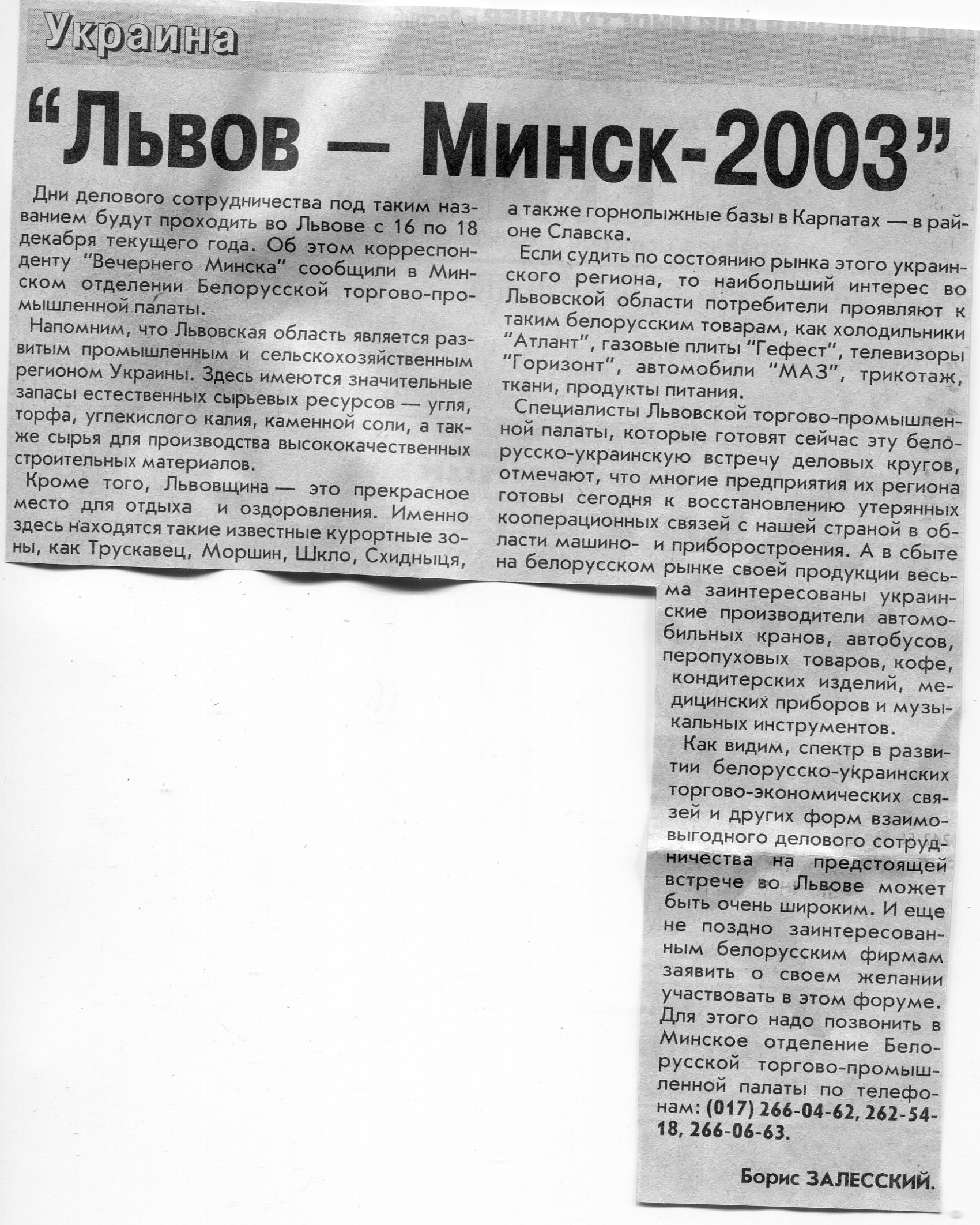 Залесский, Б. "Львов - Минск - 2003" / Б. Залесский / Вечерний Минск. - 2003. - 12 нояб.