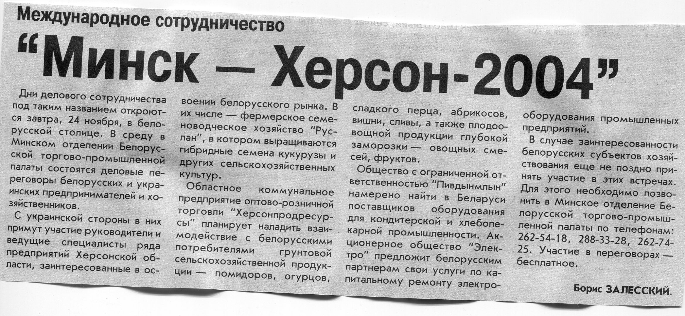 Залесский, Б. "Минск - Херсон - 2004" / Б. Залесский / Вечерний Минск. - 2004. - 23 нояб.