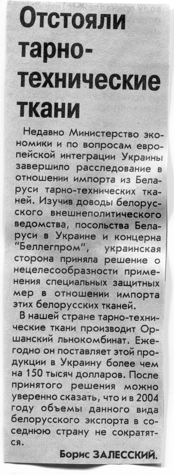 Залесский, Б. Отстояли тарно-технические ткани / Б. Залесский / Вечерний Минск. - 2004. - 3 янв.