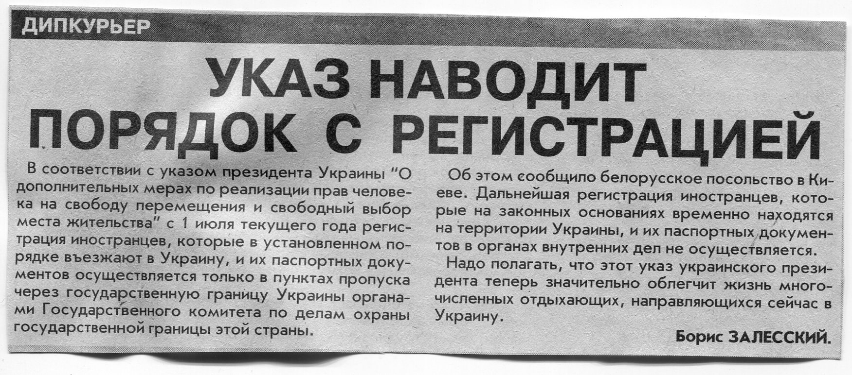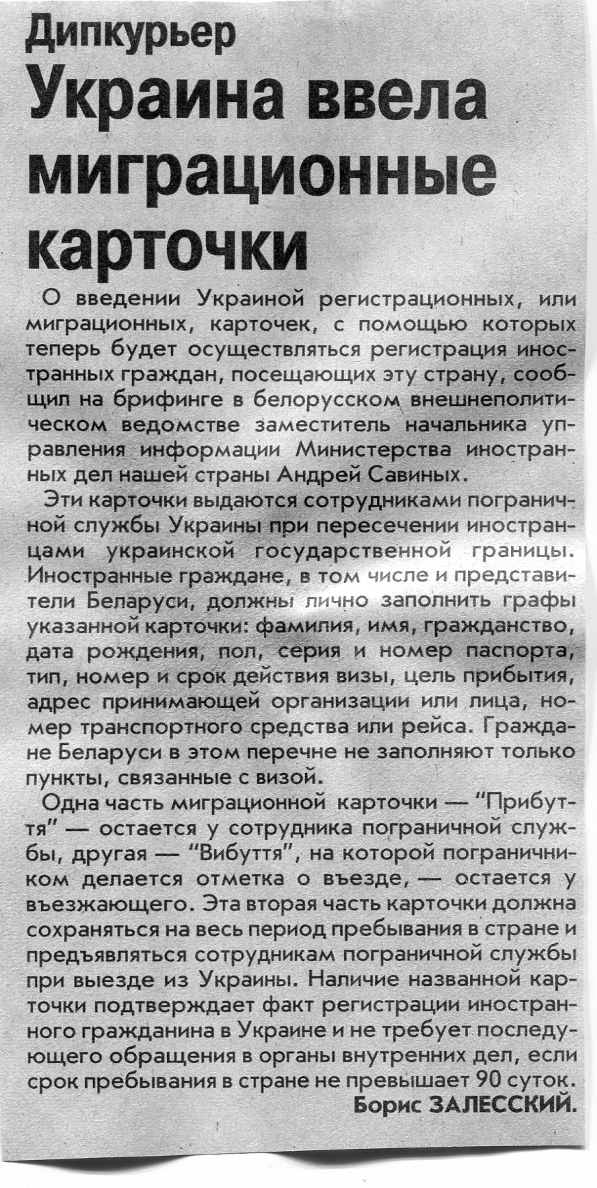 Залесский, Б. Украина ввела миграционные карточки / Б. Залесский / Вечерний Минск. - 2002. - 17 янв.