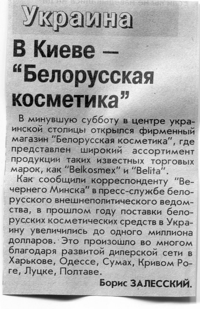Залесский, Б. В Киеве - "Белорусская косметика" / Б. Залесский / Вечерний Минск. - 2003. - 9 апр.