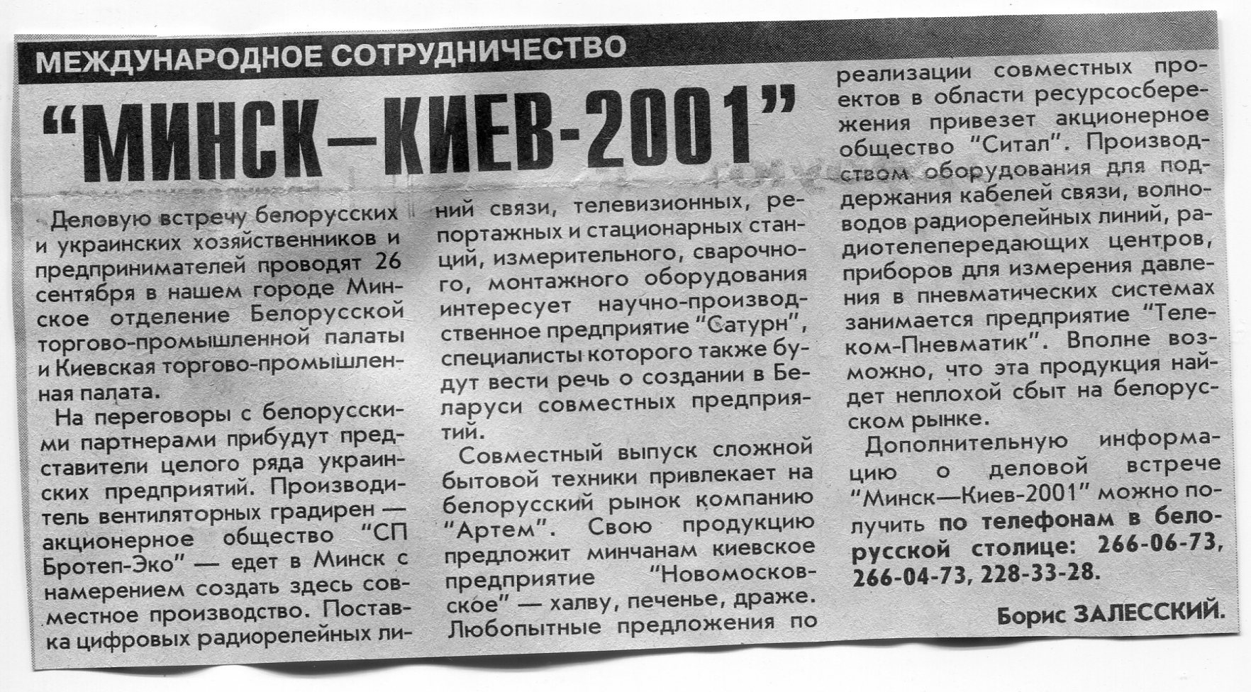 Залесский, Б. "Минск - Киев - 2001" / Б. Залесский / Вечерний Минск. - 2001. - 25 сент.
