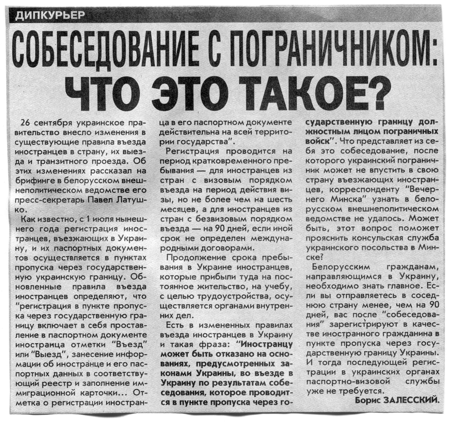 Залесский, Б. Собеседование с пограничником: что это такое? / Б. Залесский / Вечерний Минск. - 2001. - 24 окт.