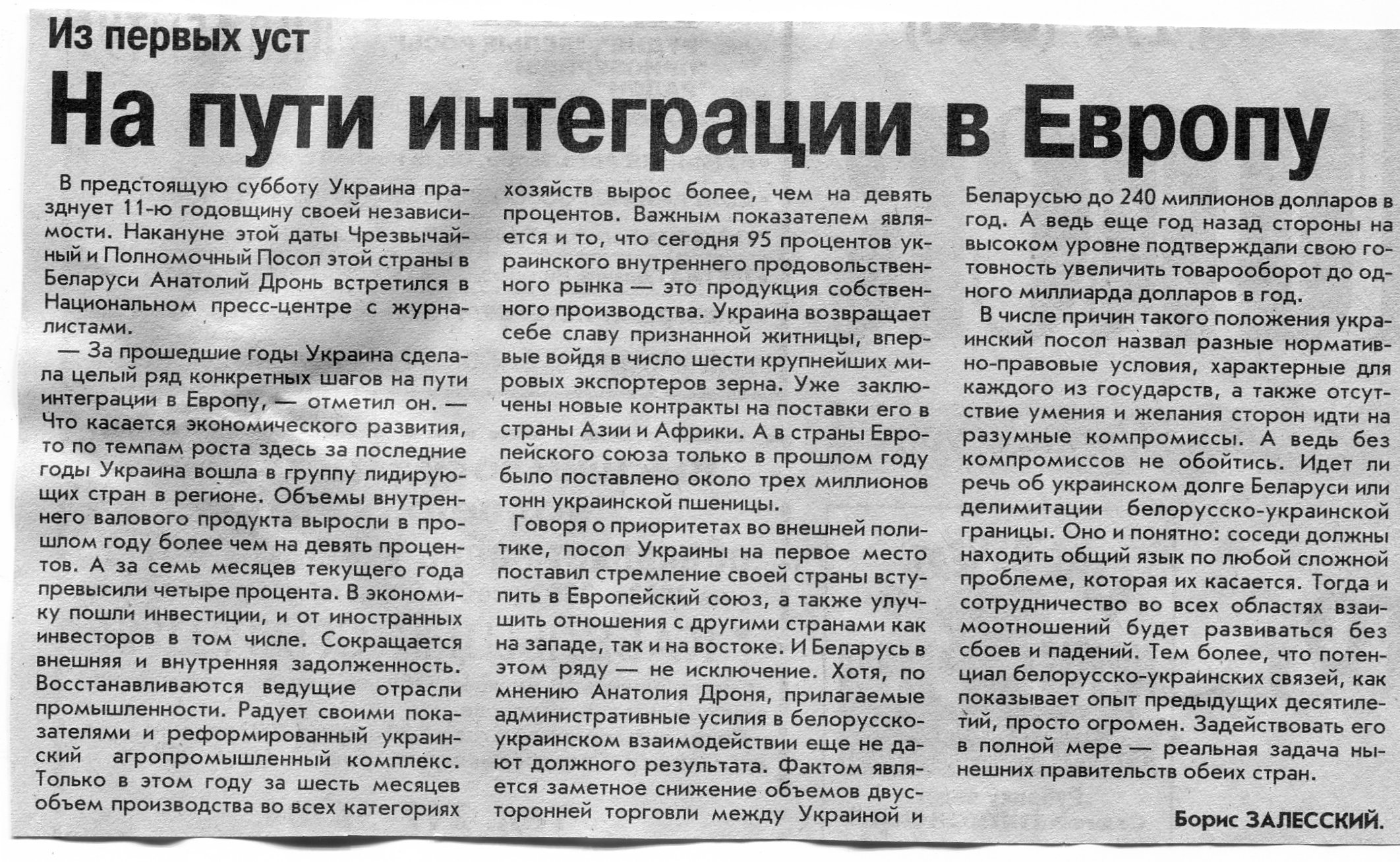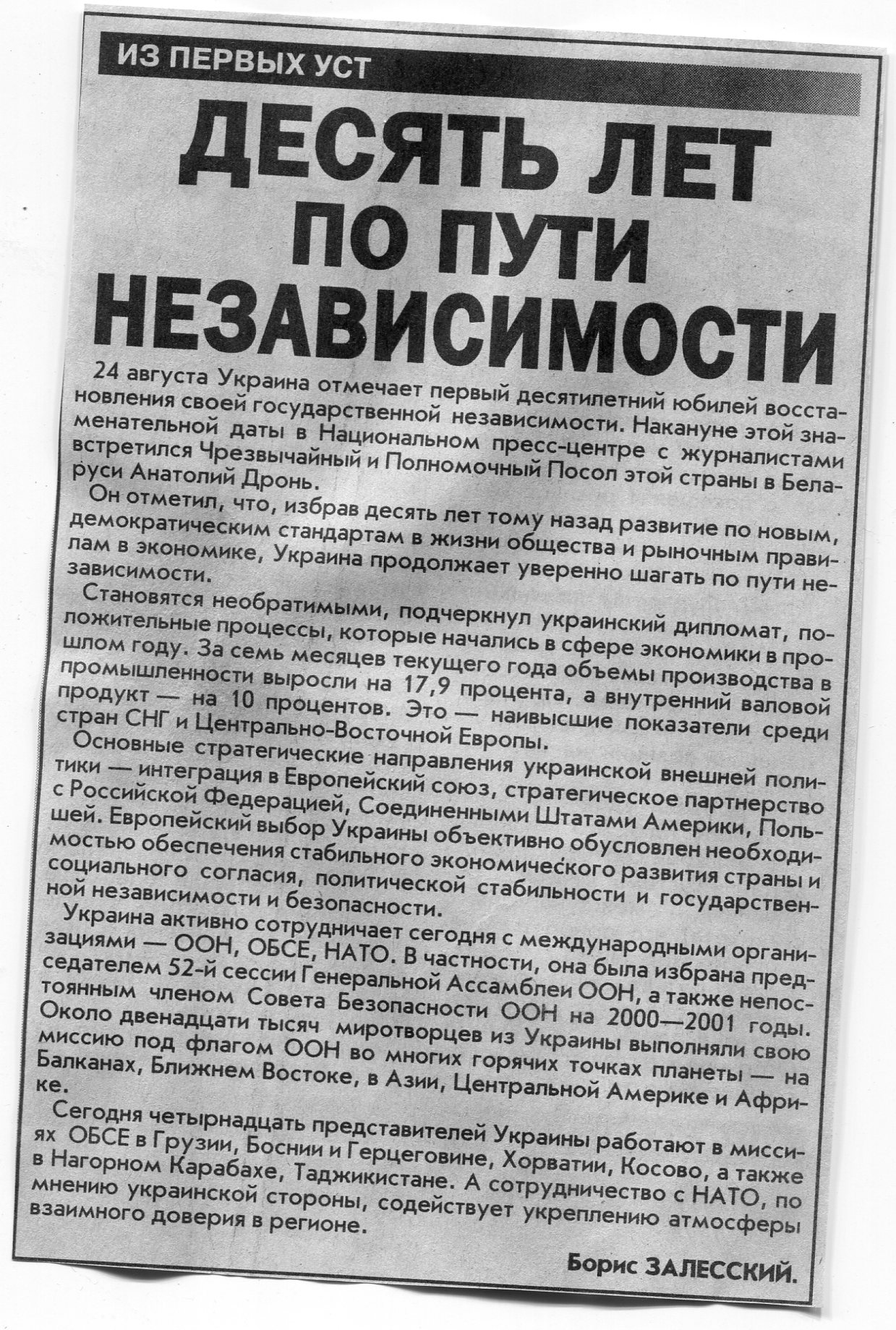 Залесский, Б. Десять лет по пути независимости / Б. Залесский / Вечерний Минск. - 2001. - 21 авг.