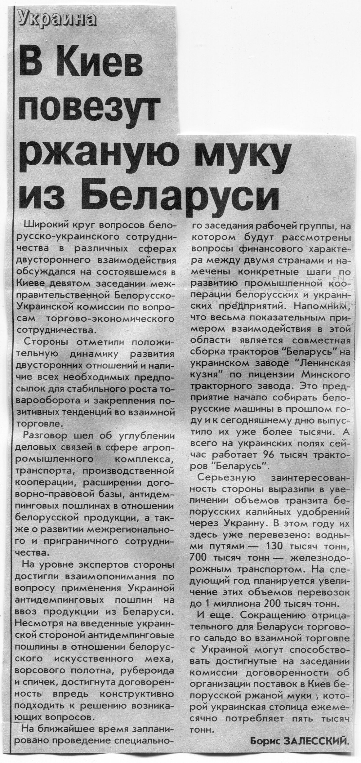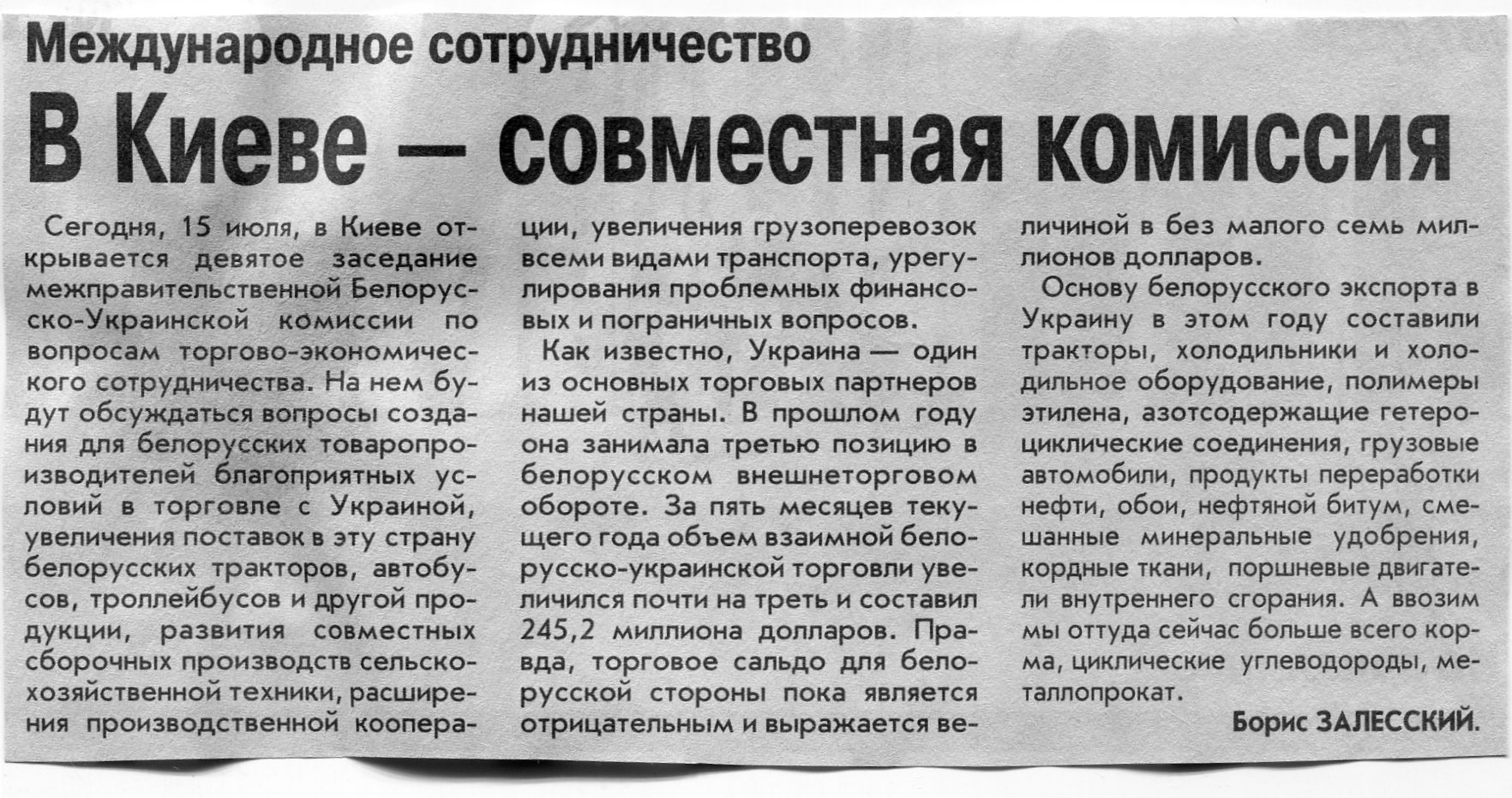 Залесский, Б. В Киеве - совместная комиссия / Б. Залесский / Вечерний Минск. - 2003. - 15 июл.