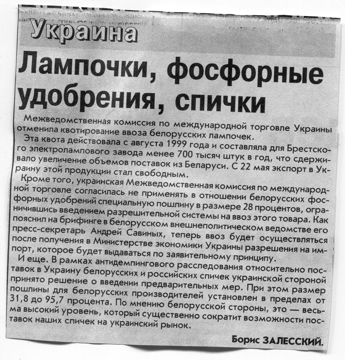 Залесский, Б. Лампочки, фосфорные удобрения, спички / Б. Залесский / Вечерний Минск. - 2003. - 23 мая.