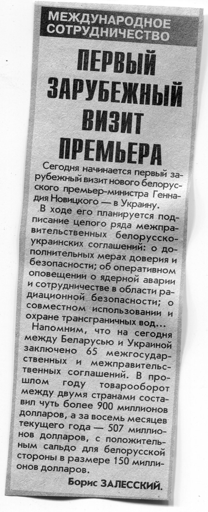 Залесский, Б. Первый зарубежный визит премьера / Б. Залесский / Вечерний Минск. - 2001. - 16 окт.