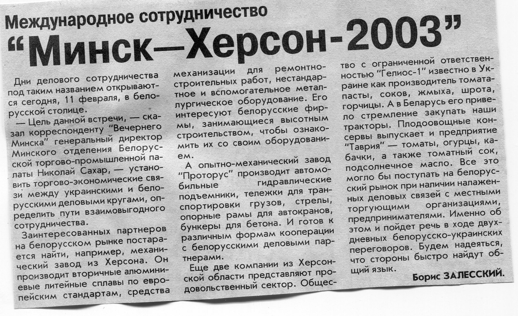 Залесский, Б. "Минск - Херсон - 2003" / Б. Залесский / Вечерний Минск. - 2003. - 11 февр.