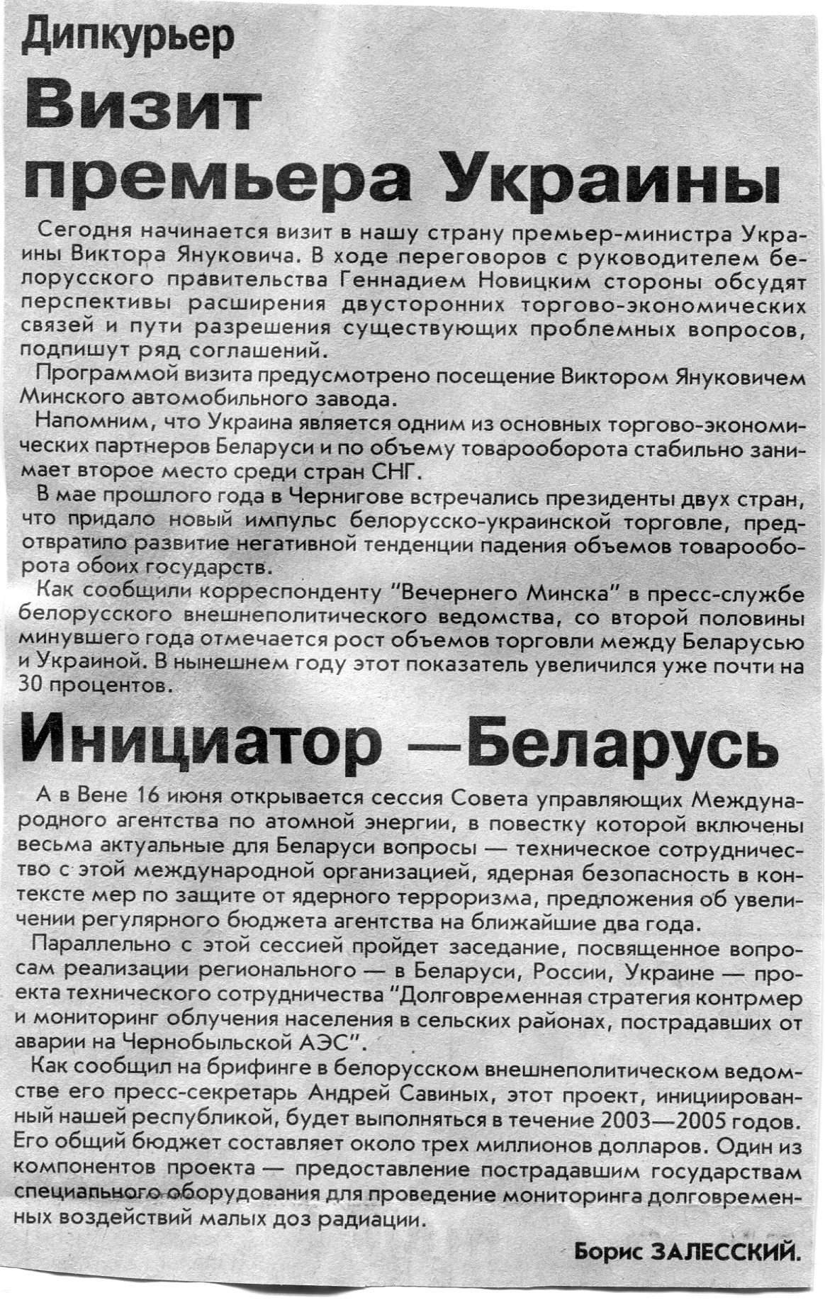 Залесский, Б. Визит премьера Украины / Б. Залесский // Вечерний Минск. - 2003. - 16 июн.