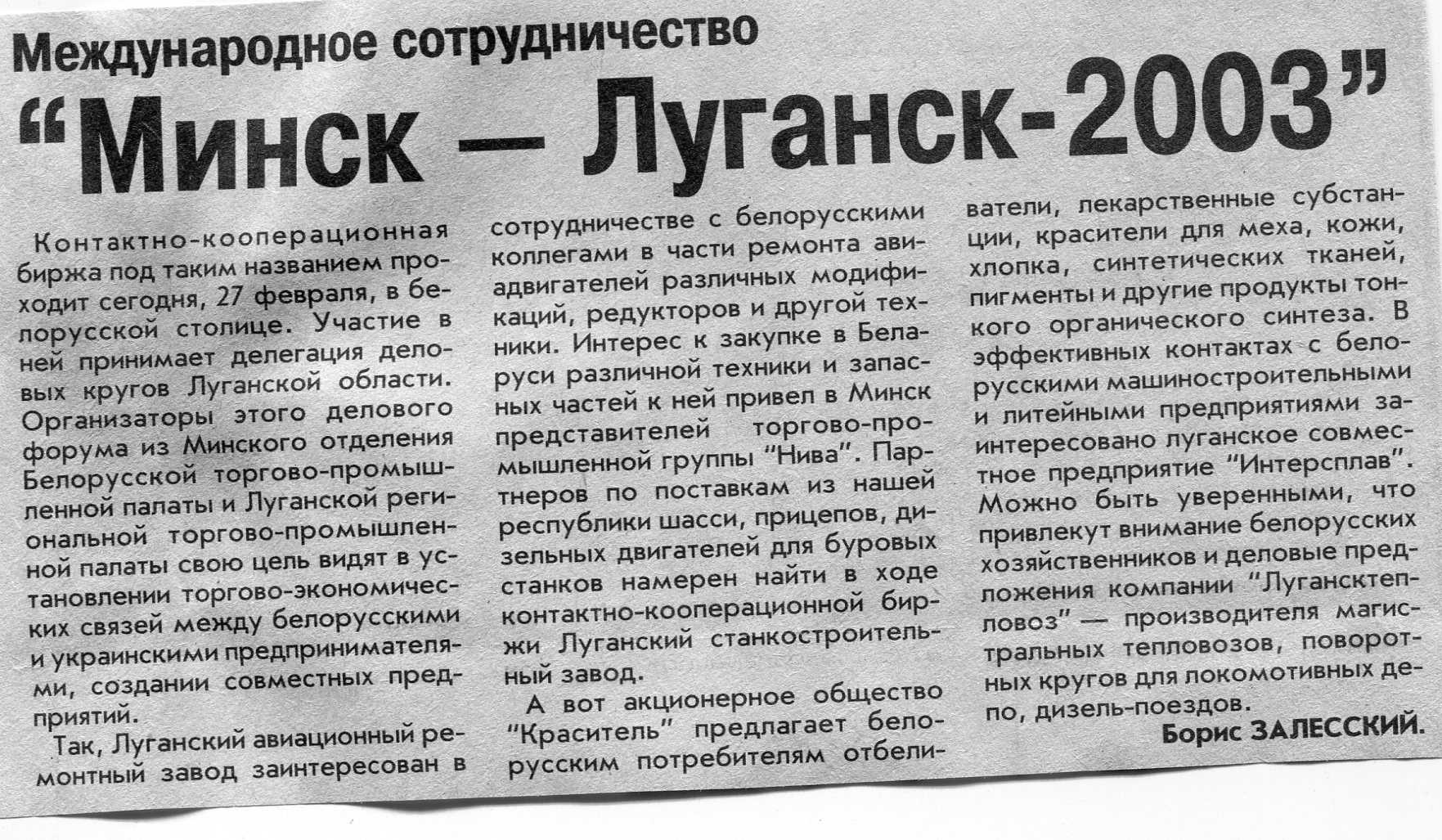 Залесский, Б. "Минск - Луганск - 2003" / Б. Залесский / Вечерний Минск. - 2003. - 27 февр.