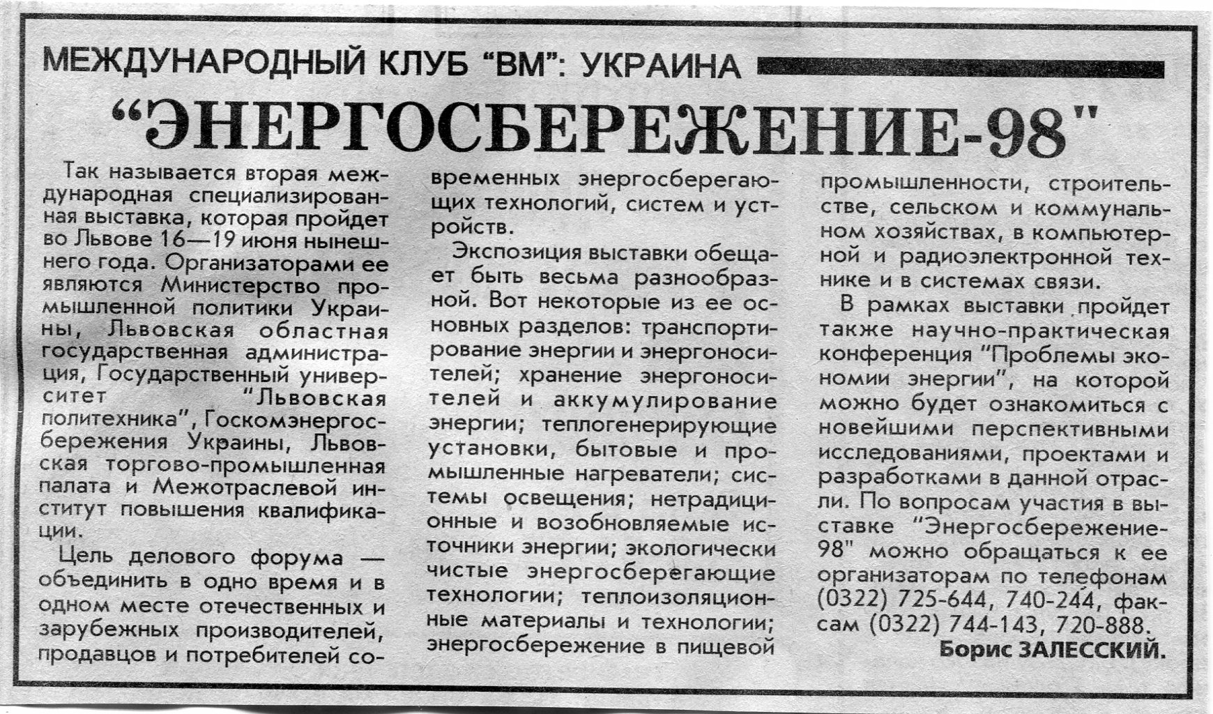 Залесский, Б. "Энергосбережение-98" / Б. Залесский // Вечерний Минск. - 1998. - 25 мар.