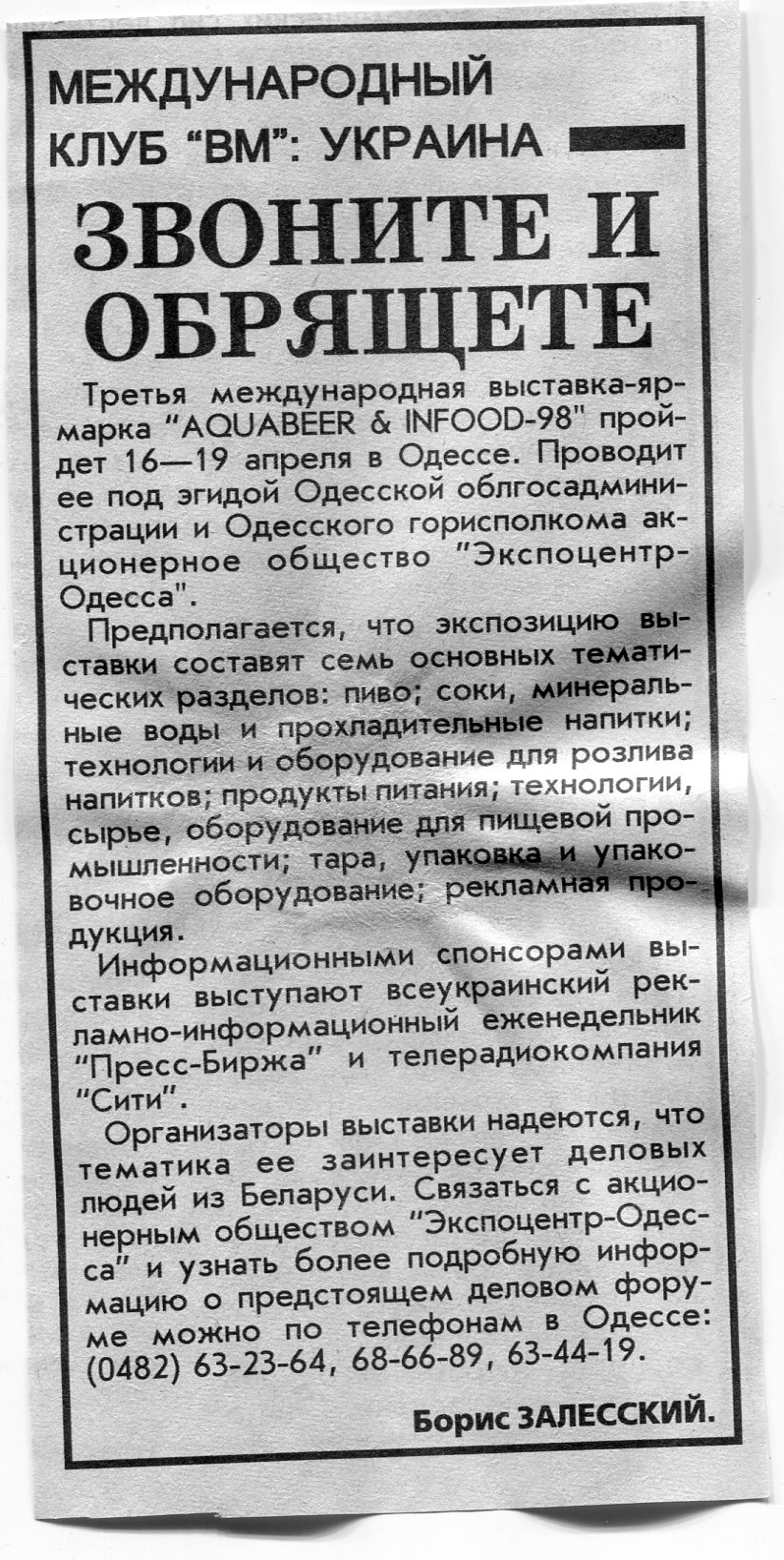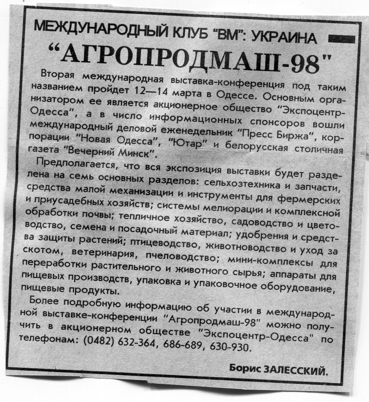 Залесский, Б. "Продэкспо-98. Весна" / Б. Залесский // Вечерний Минск. - 1998. - 10 апр.