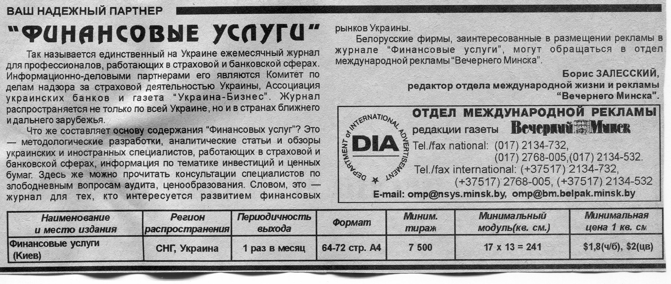 Залесский, Б. "Финансовые услуги" / Б. Залесский // Вечерний Минск. – 1998. – 30 июл.