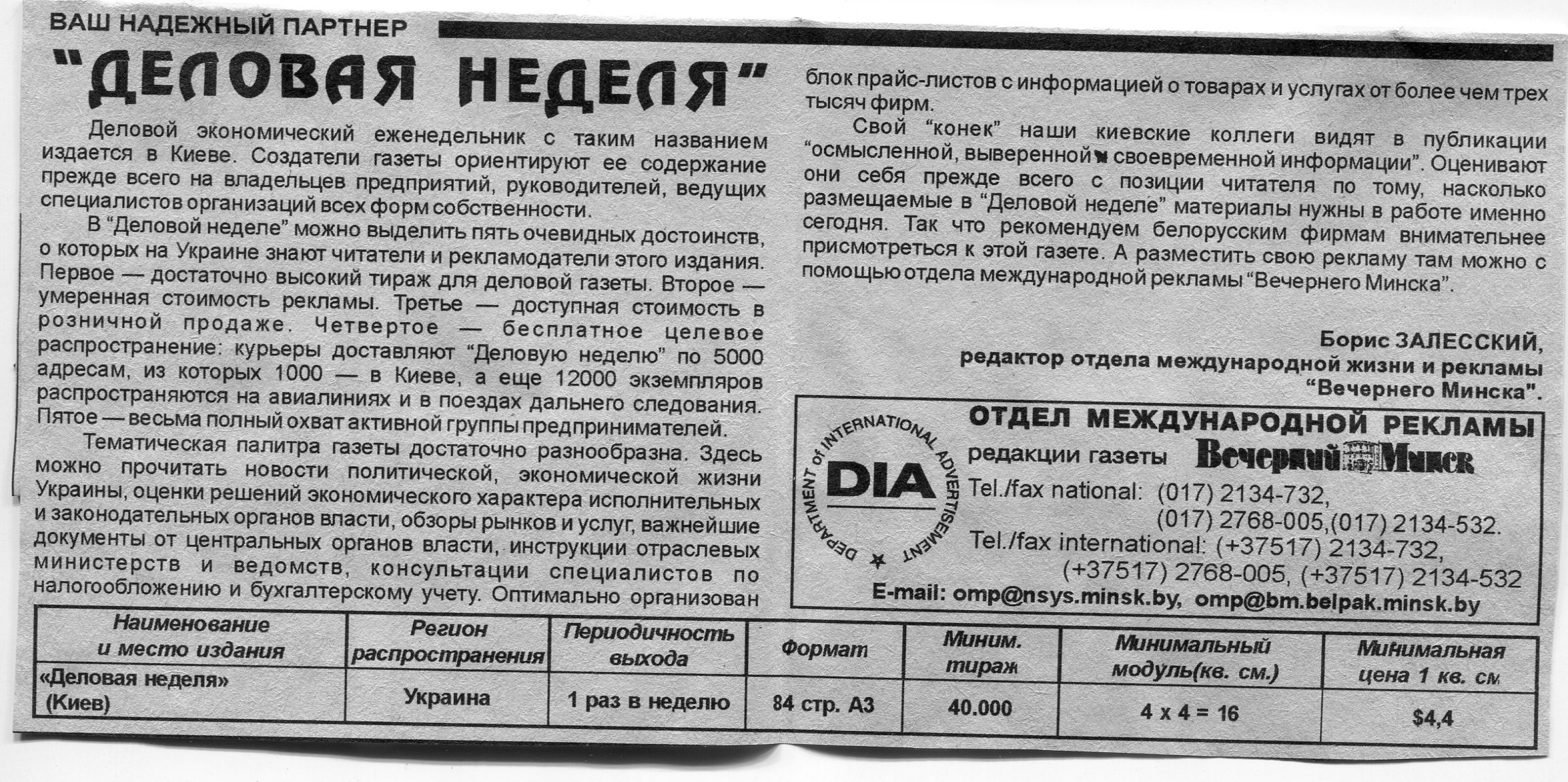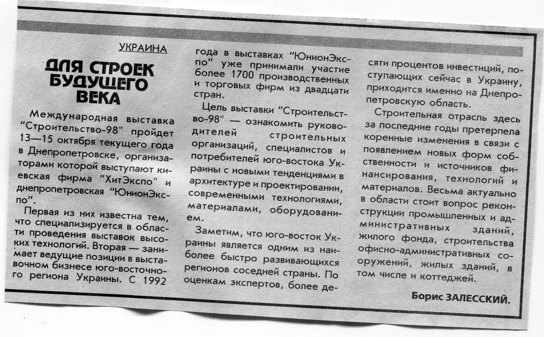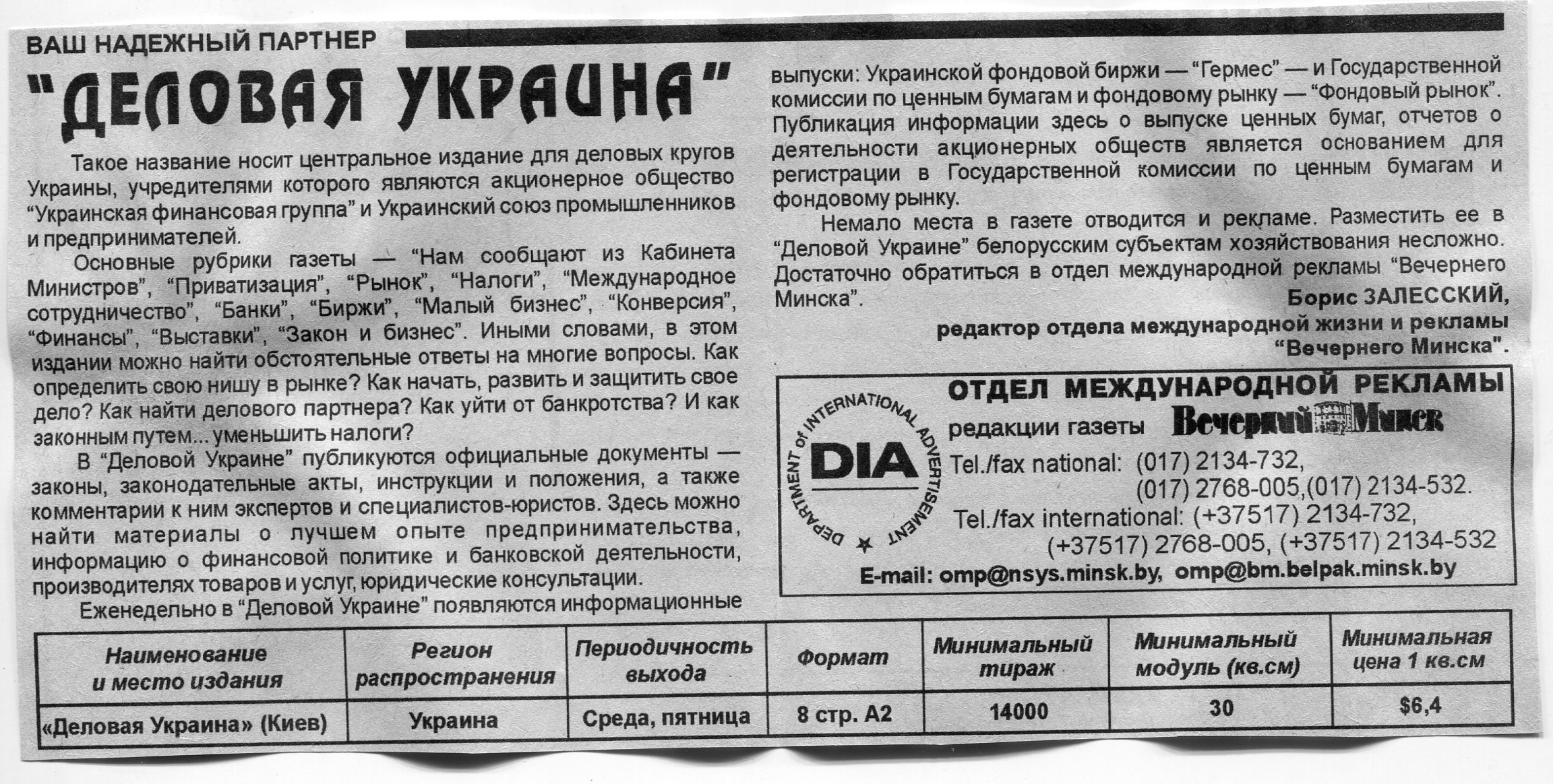 Залесский, Б. "Деловая Украина" / Б. Залесский // Вечерний Минск. – 1998. – 11 мар.