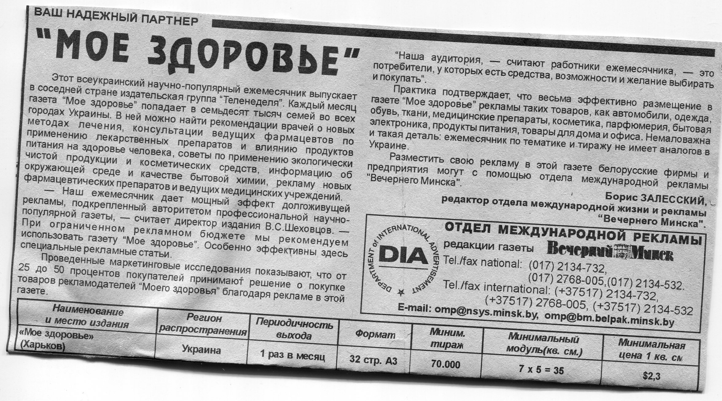 Залесский, Б. "Мое здоровье" / Б. Залесский // Вечерний Минск. – 1997. – 30 дек.
