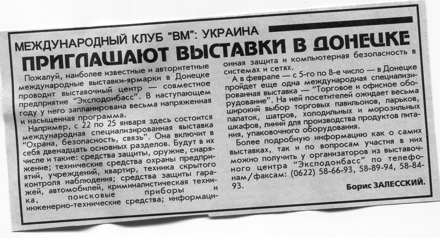 Залесский, Б. Приглашают выставки в Донецке / Б. Залесский // Вечерний Минск. - 1997. - 23 дек.