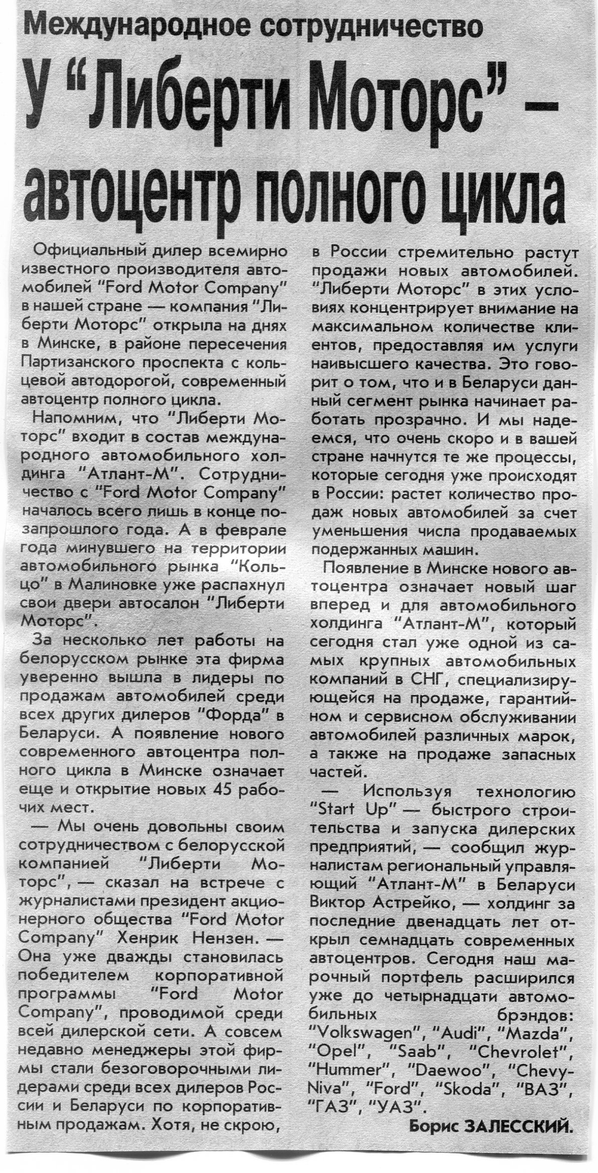 Залесский, Б. У "Либерти Моторс" - автоцентр полного цикла / Б. Залесский // Вечерний Минск. – 2004. - 27 мая.