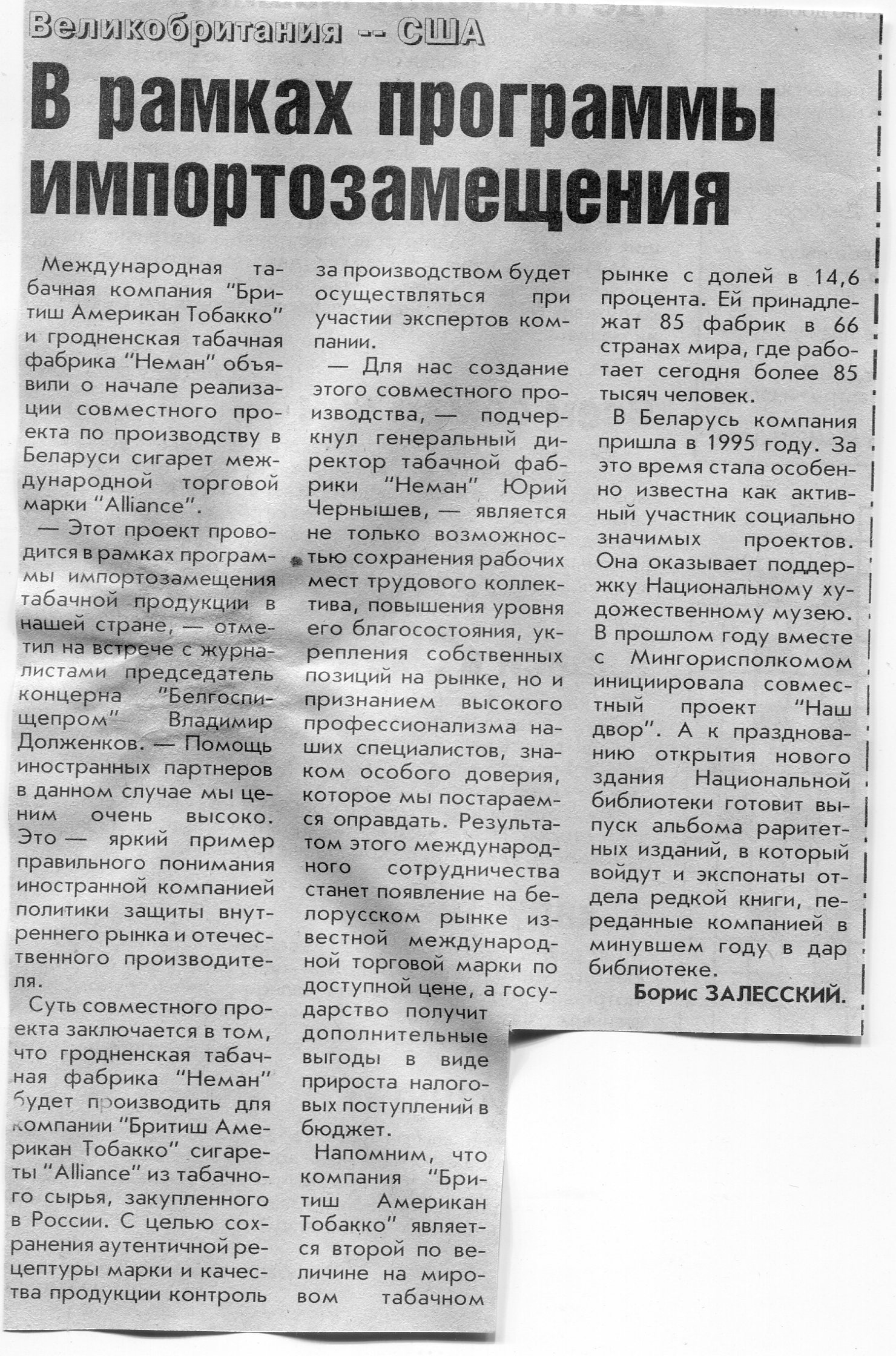 Залесский, Б. В рамках программы импортозамещения / Б. Залесский // Вечерний Минск. - 2005. - 8 июл.
