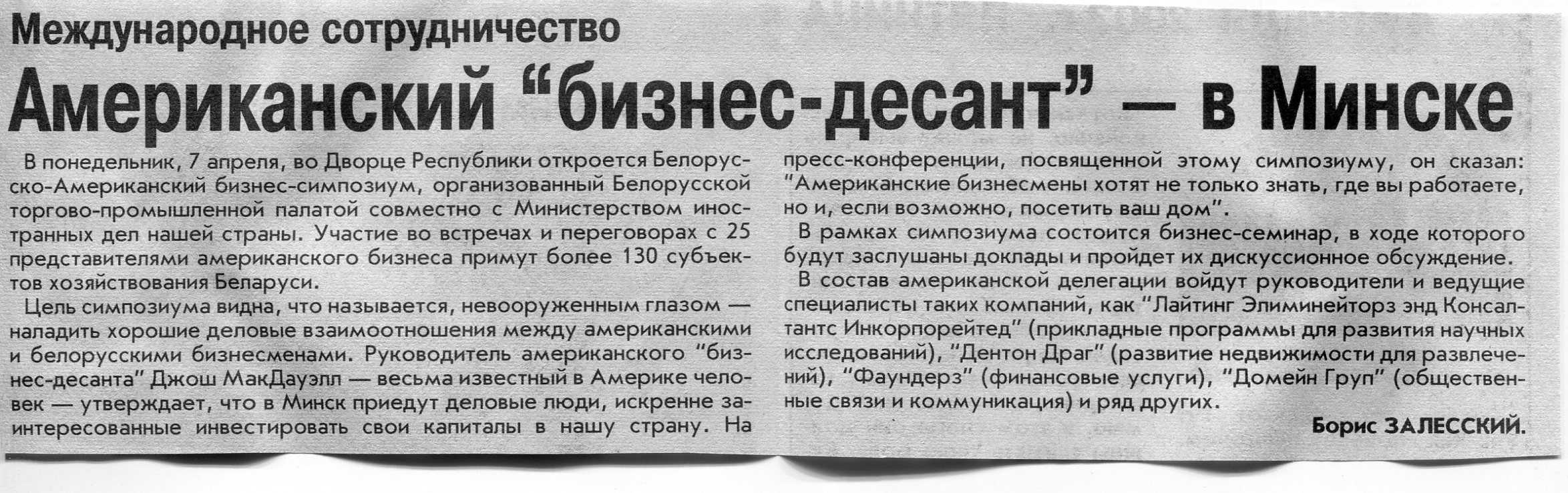 Залесский, Б. Американский "бизнес-десант" - в Минске / Б. Залесский // Вечерний Минск. - 2003. - 4 апр.