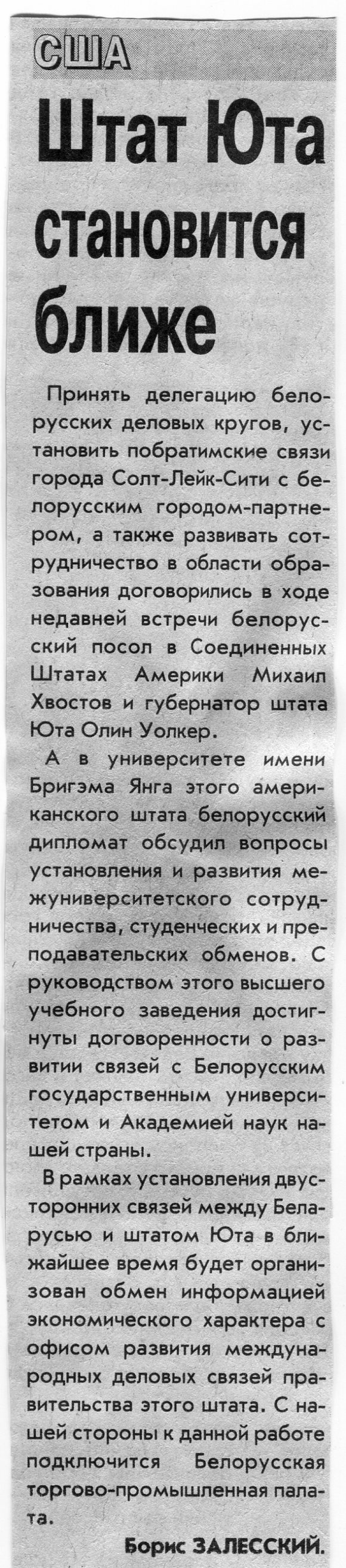 Залесский, Б. Штат Юта становится ближе / Б. Залесский // Вечерний Минск. - 2004. - 1 апр.