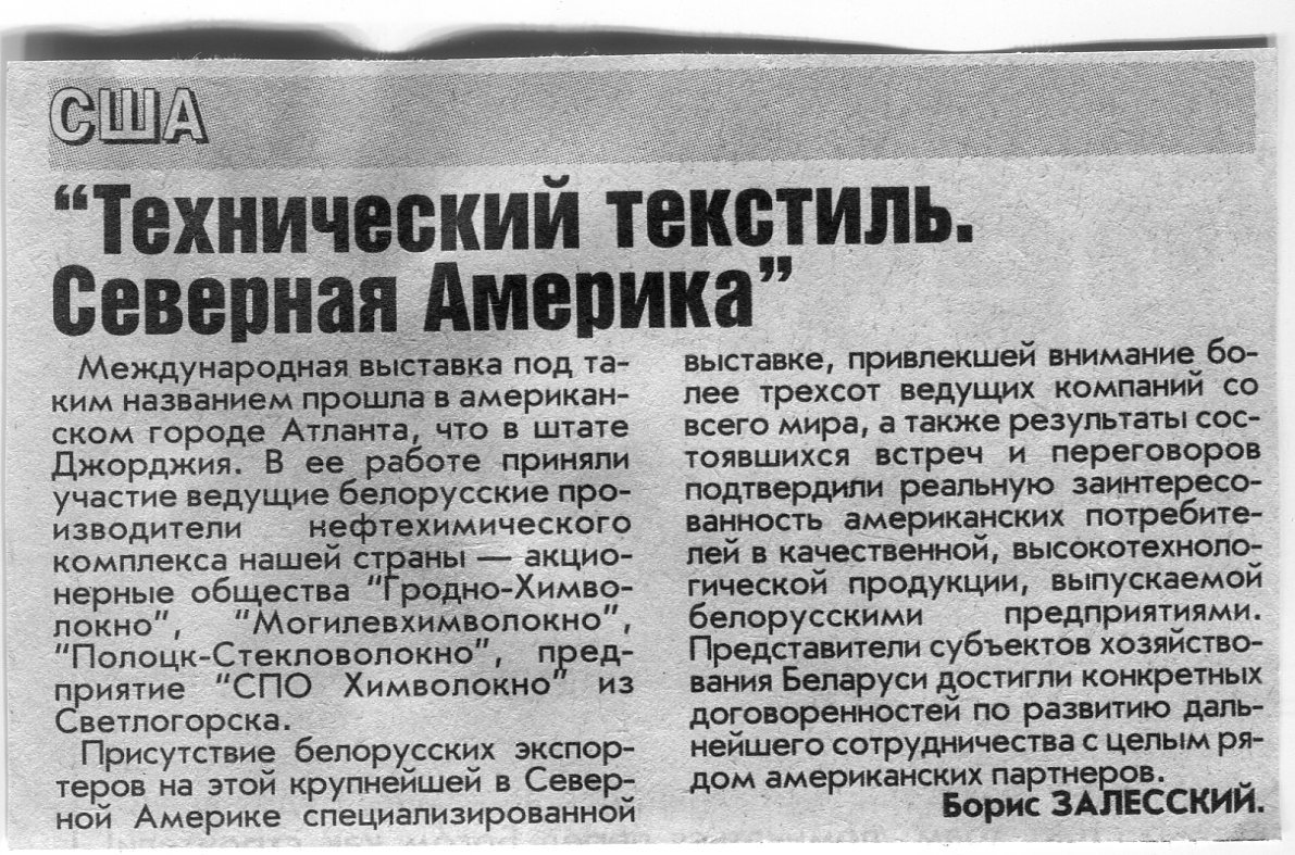 Залесский, Б. "Технический текстиль. Северная Америка" / Б. Залесский // Вечерний Минск. - 2006. - 5 апр.