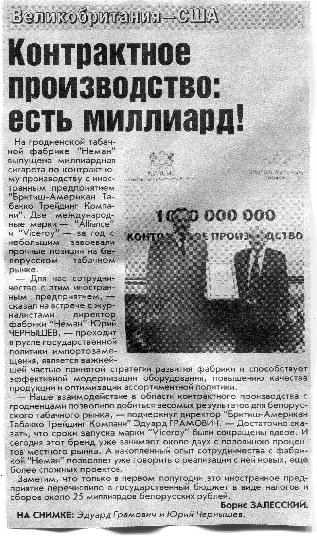 Залесский, Б. Контрактное производство: есть миллиард! / Б. Залесский // Вечерний Минск. - 2006. - 1 нояб.