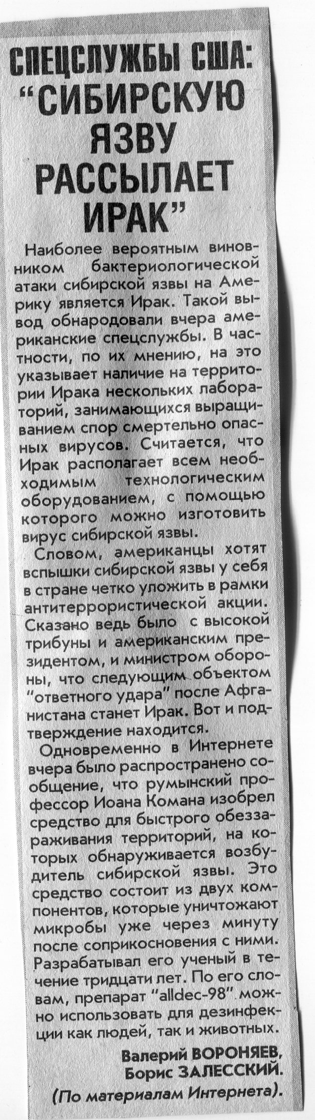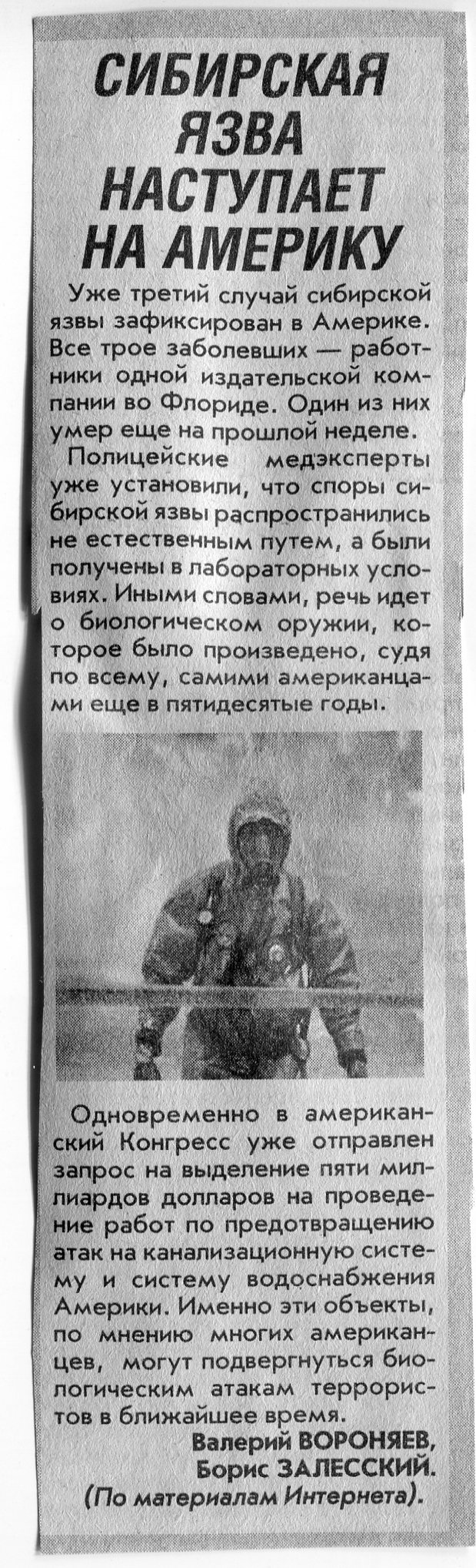 Залесский, Б. Сибирская язва наступает на Америку / Б. Залесский, В. Вороняев // Вечерний Минск. - 2001. - 10 окт.